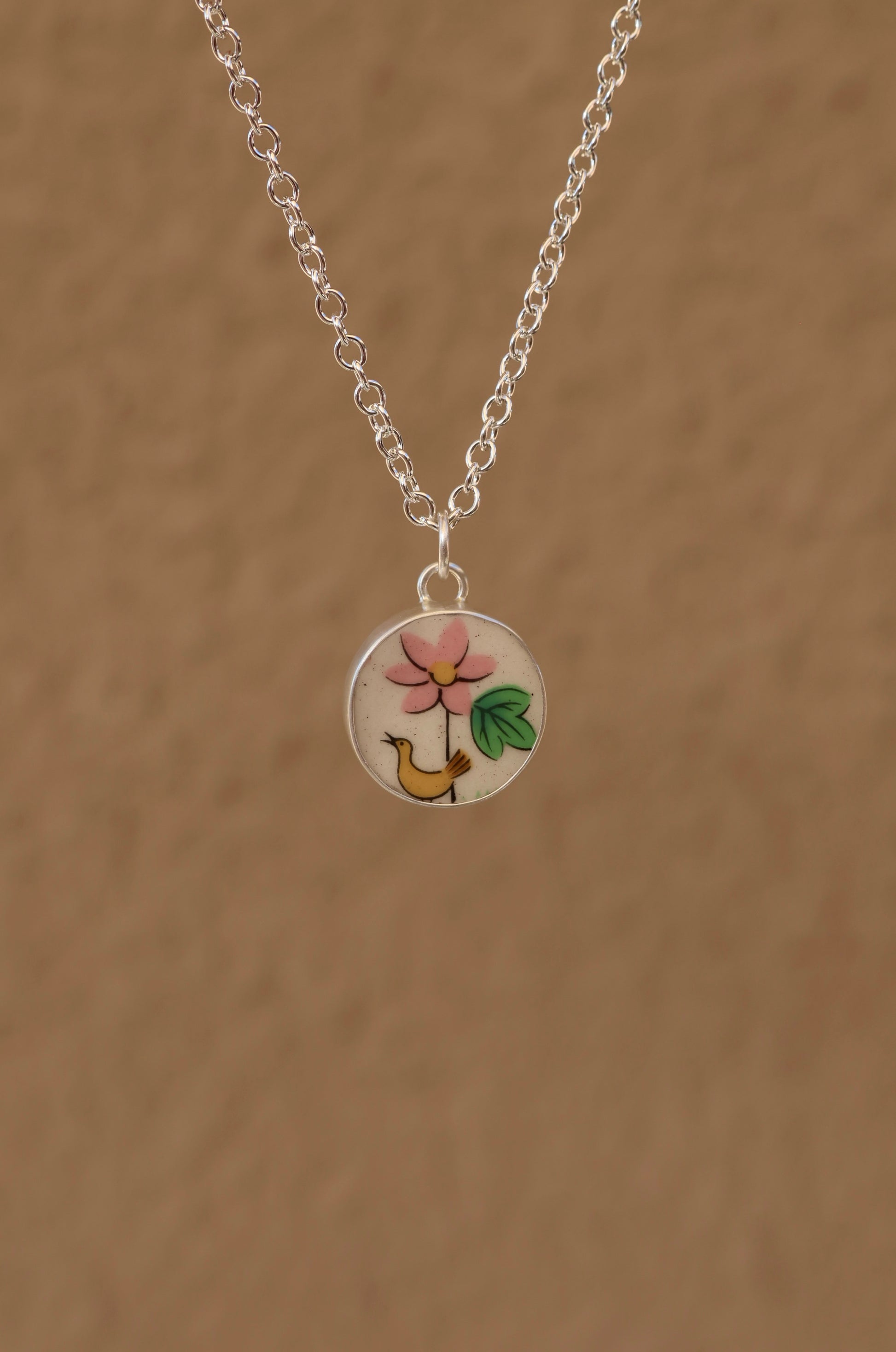 A round ceramic piece cut from a plate of the vintage International Heartland stoneware collection, featuring a bird and a flower, is set in a sterling silver bezel setting. The backplate is made from recycled silver, milled in Allison's studio. The pendant hangs on an 18" sterling silver chain with a lobster clasp closure.
