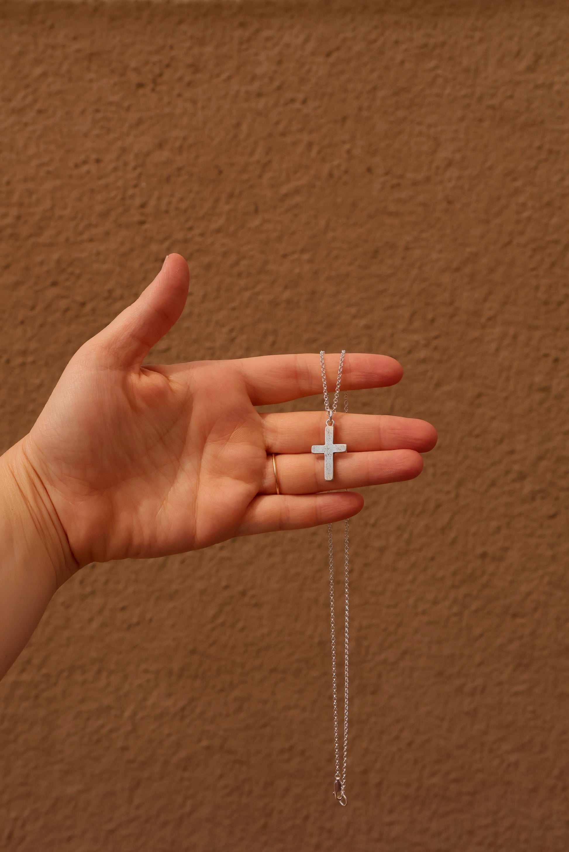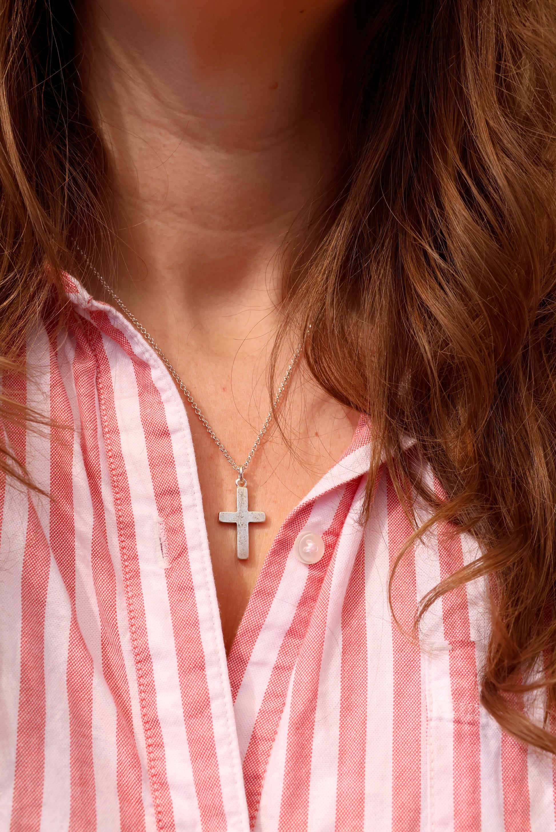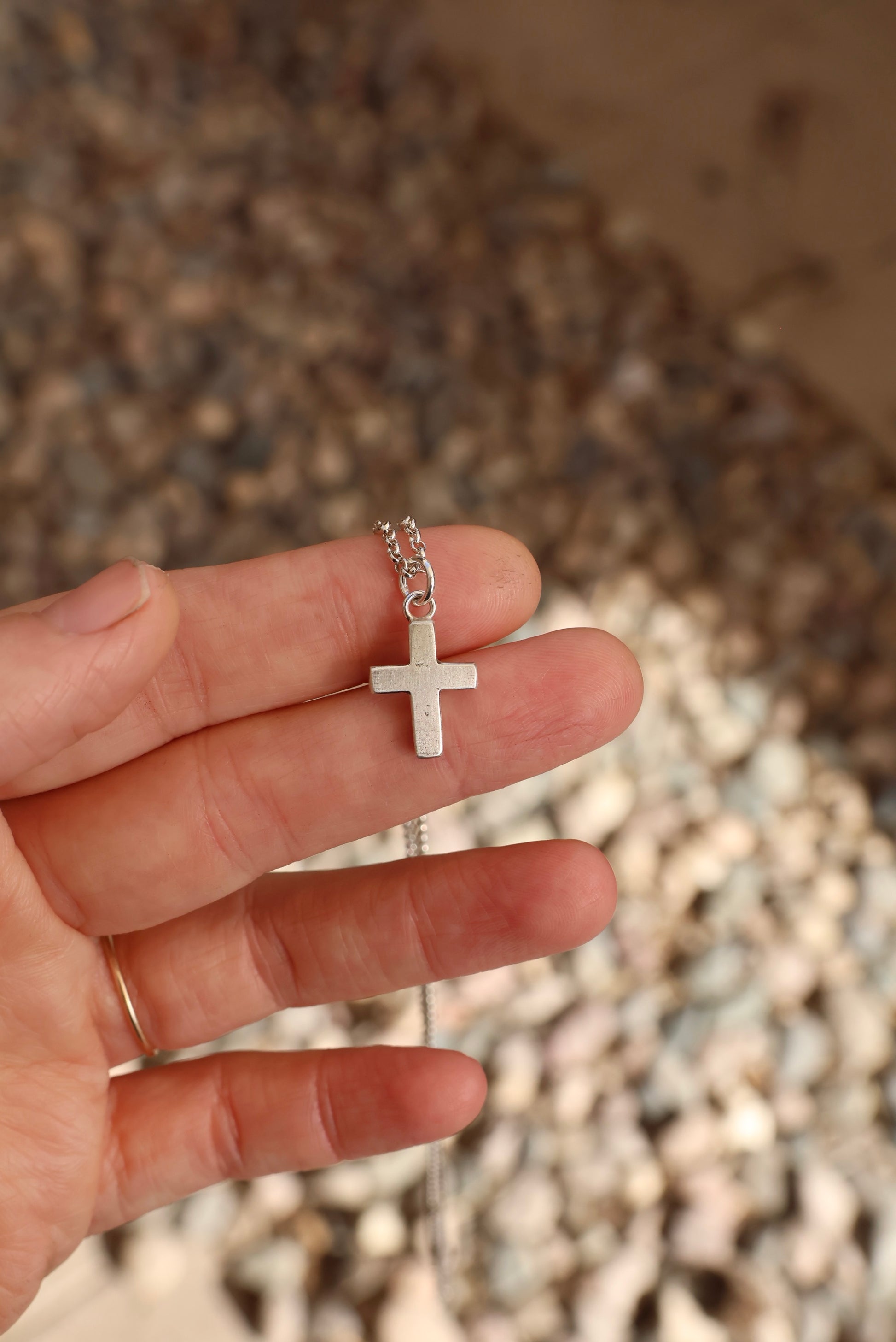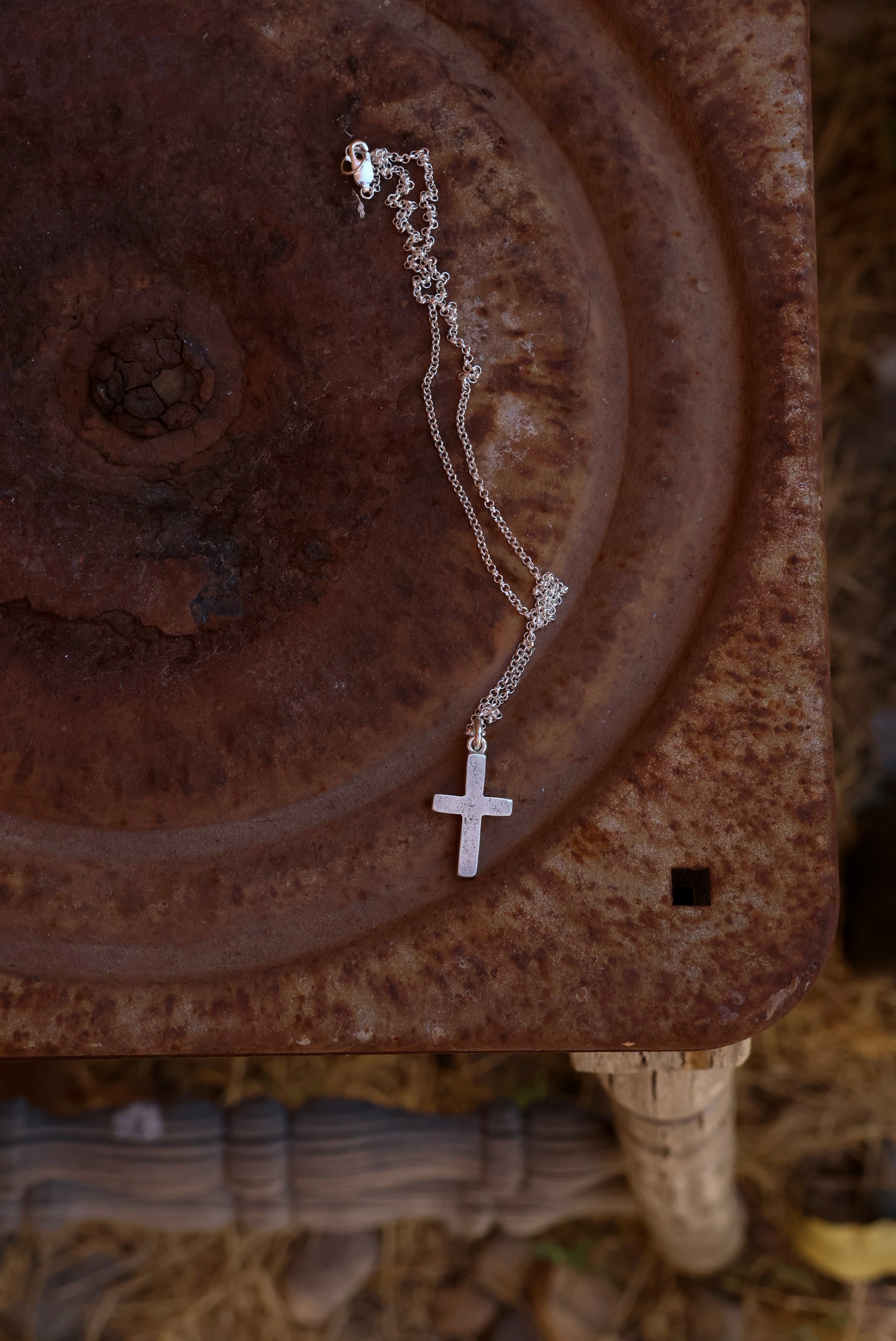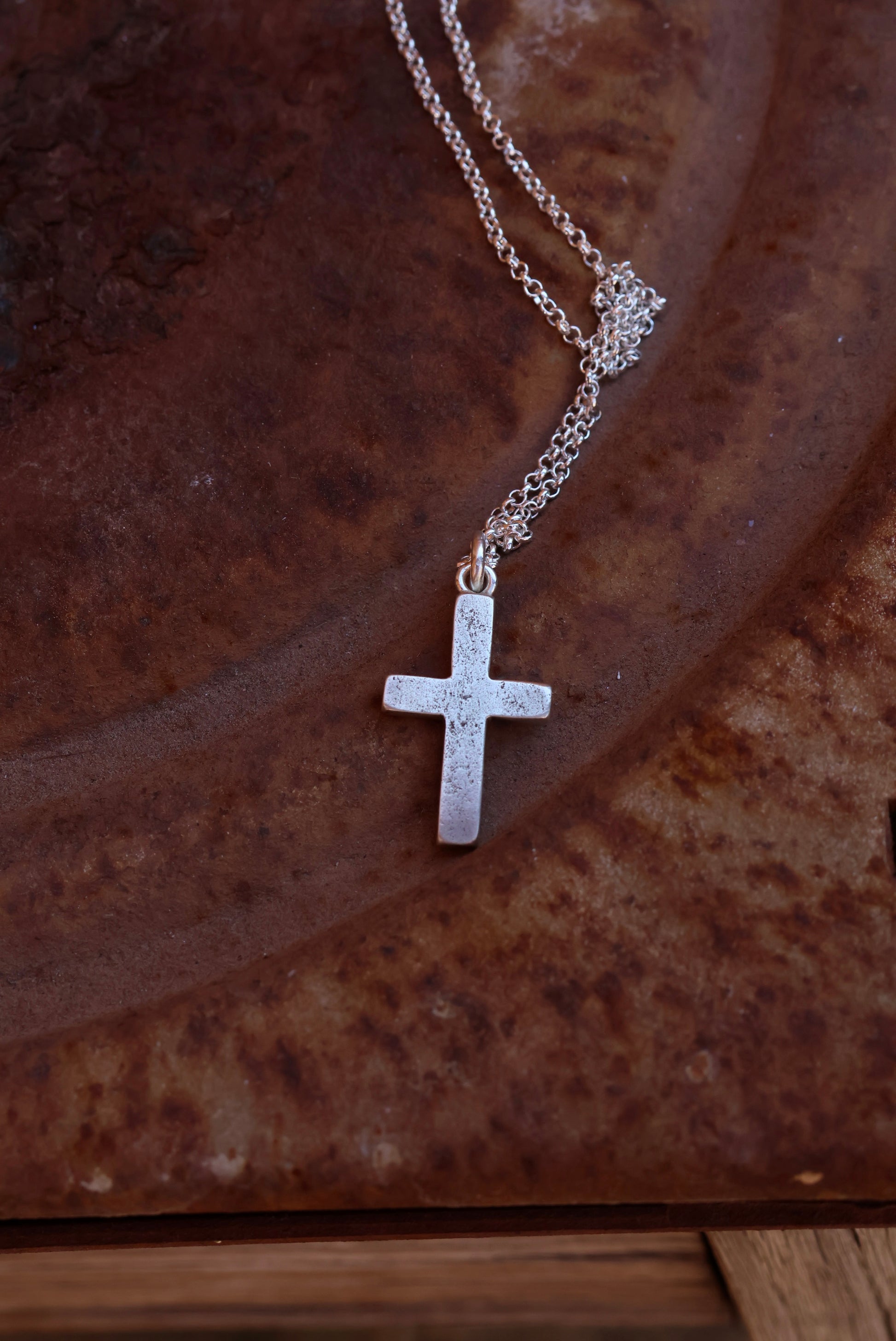 A hand fabricated cross pendant made from recycled silver, milled in studio by Allison. The cross is nice and thick with a rustic texture. It hangs on an 18” sterling silver chain with a lobster clasp.