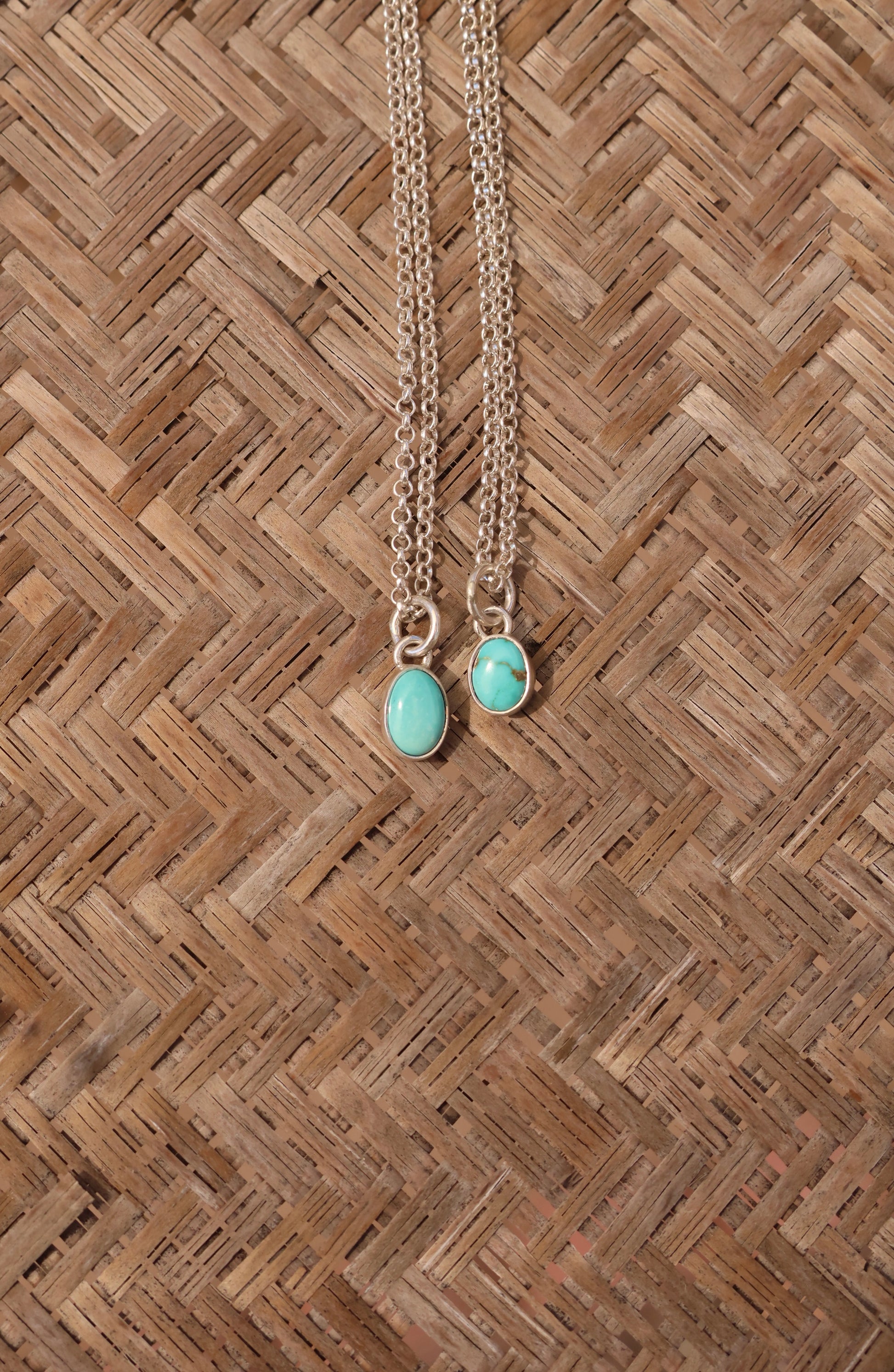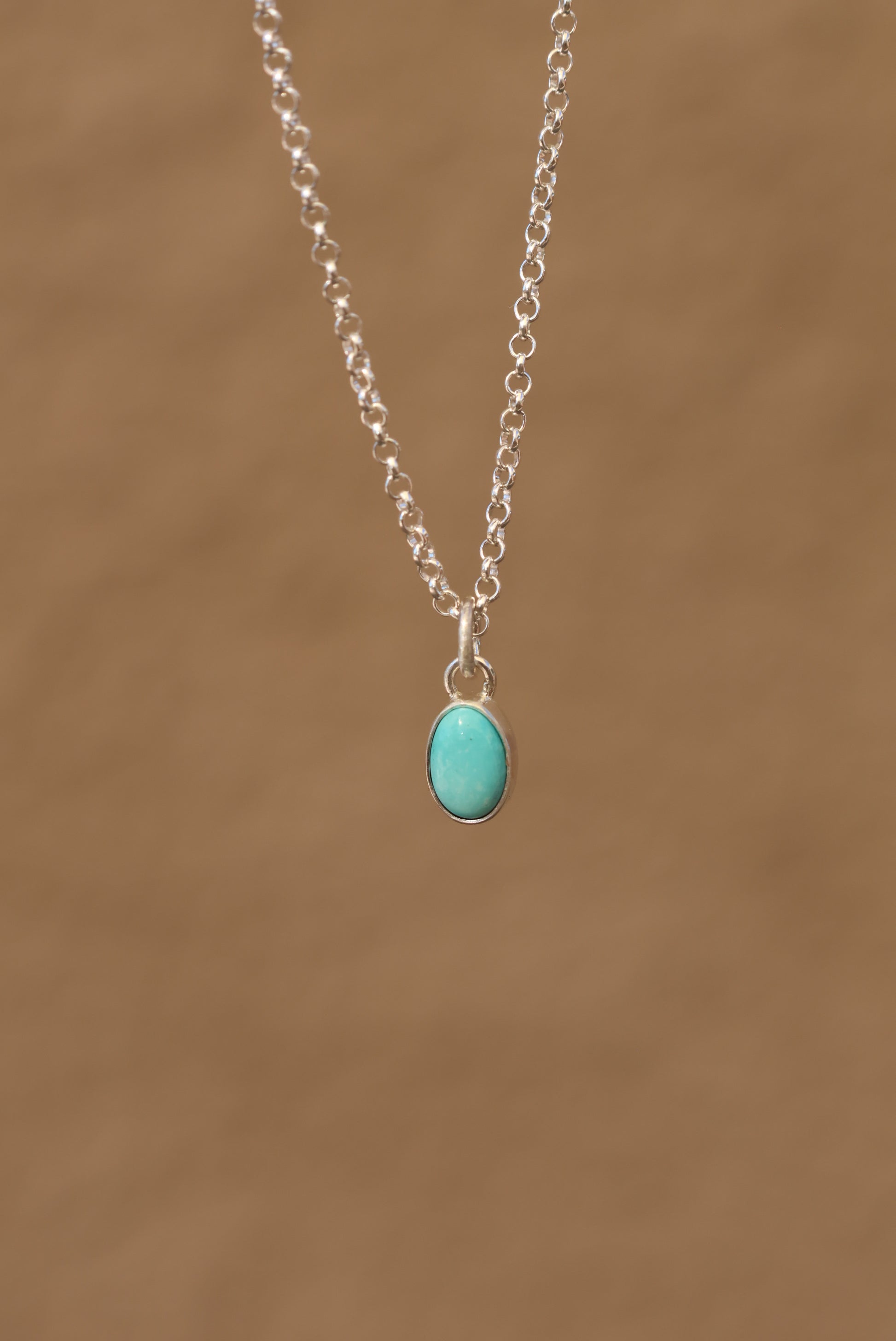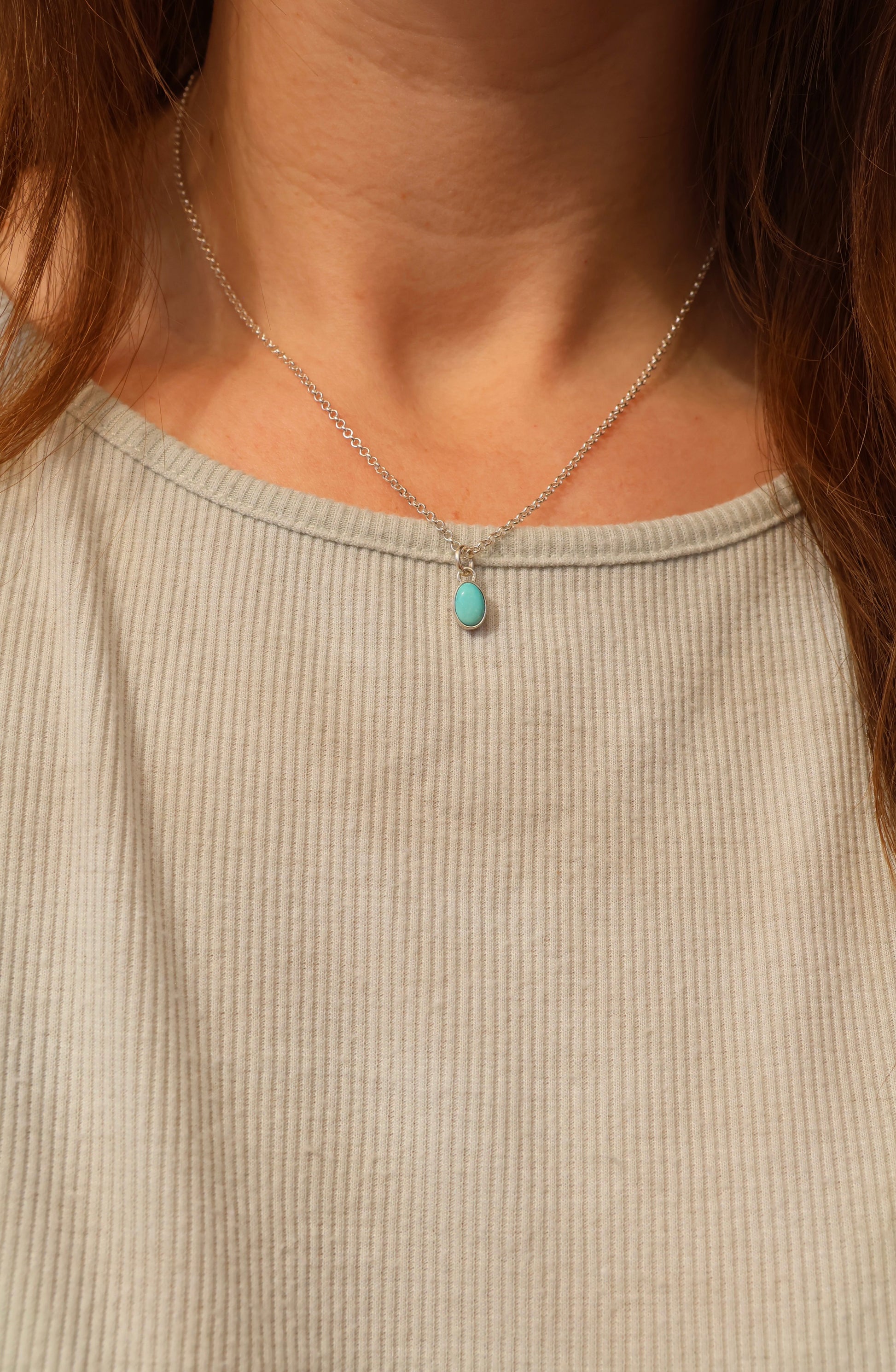 An itty bitty freeform Kingman Turquoise cabochon is set in a sterling silver bezel setting and hangs on a chain that is adjustable from 16" to 17" in length.