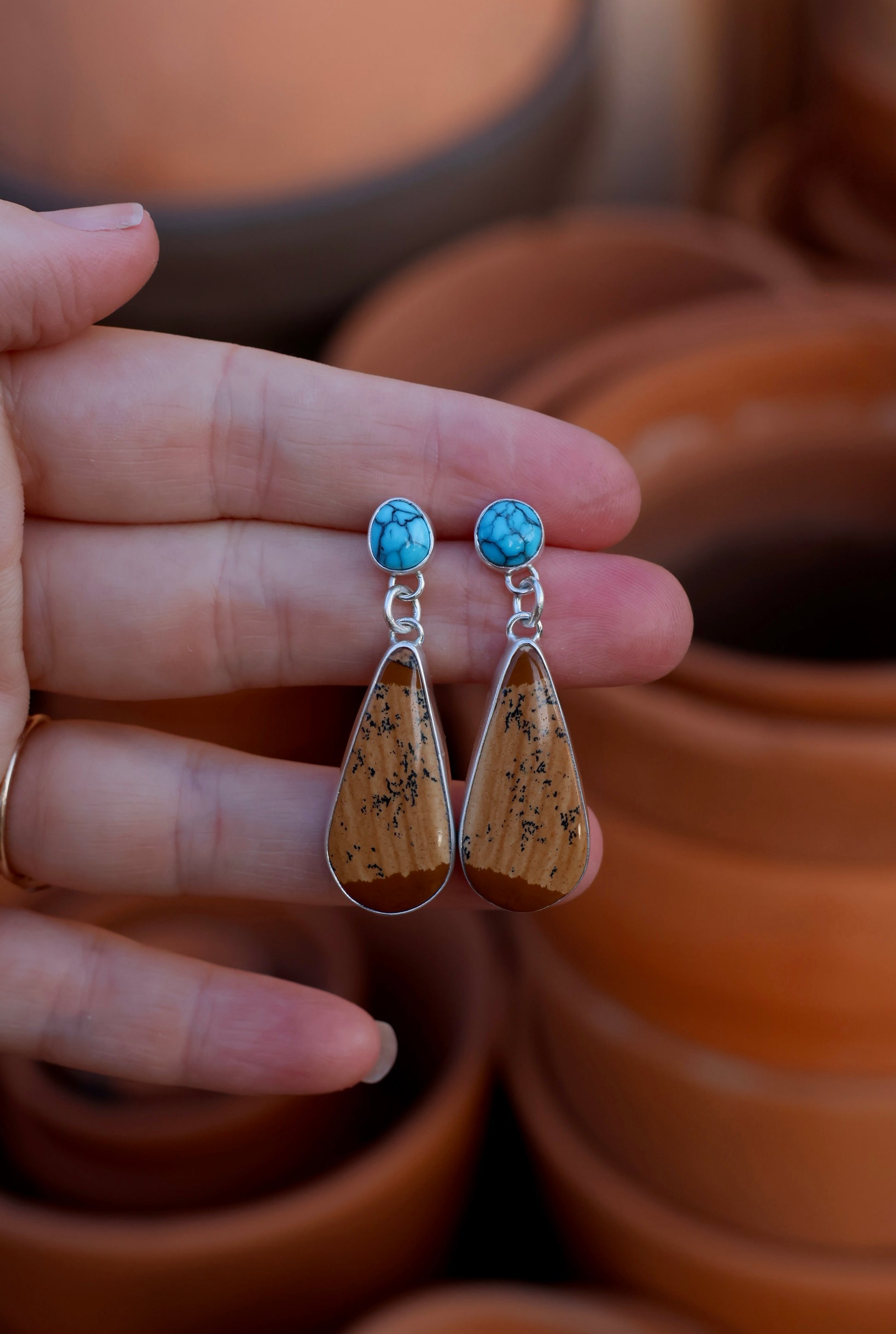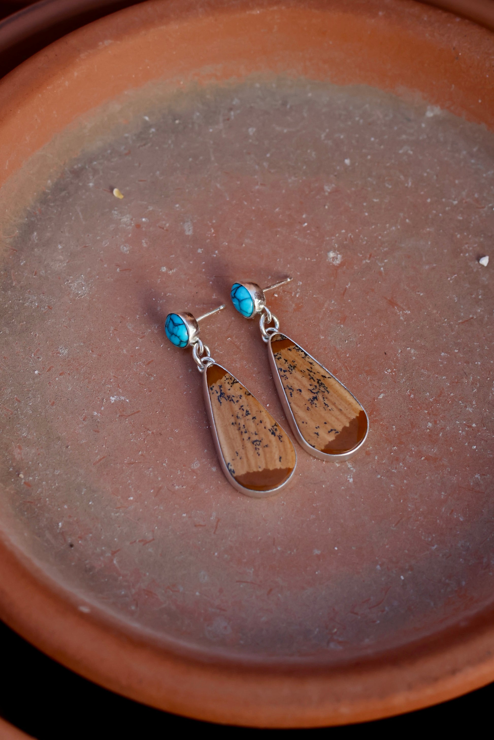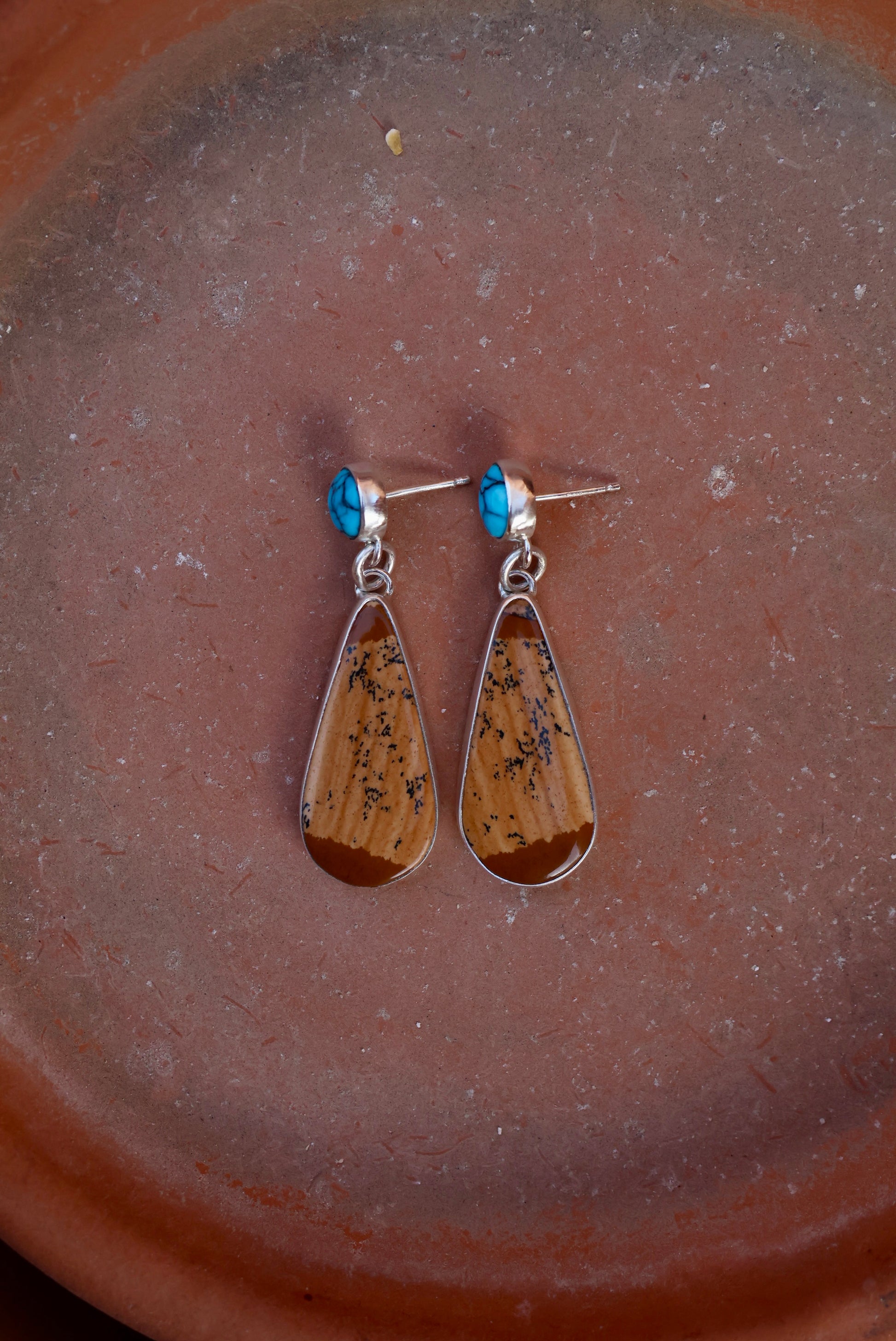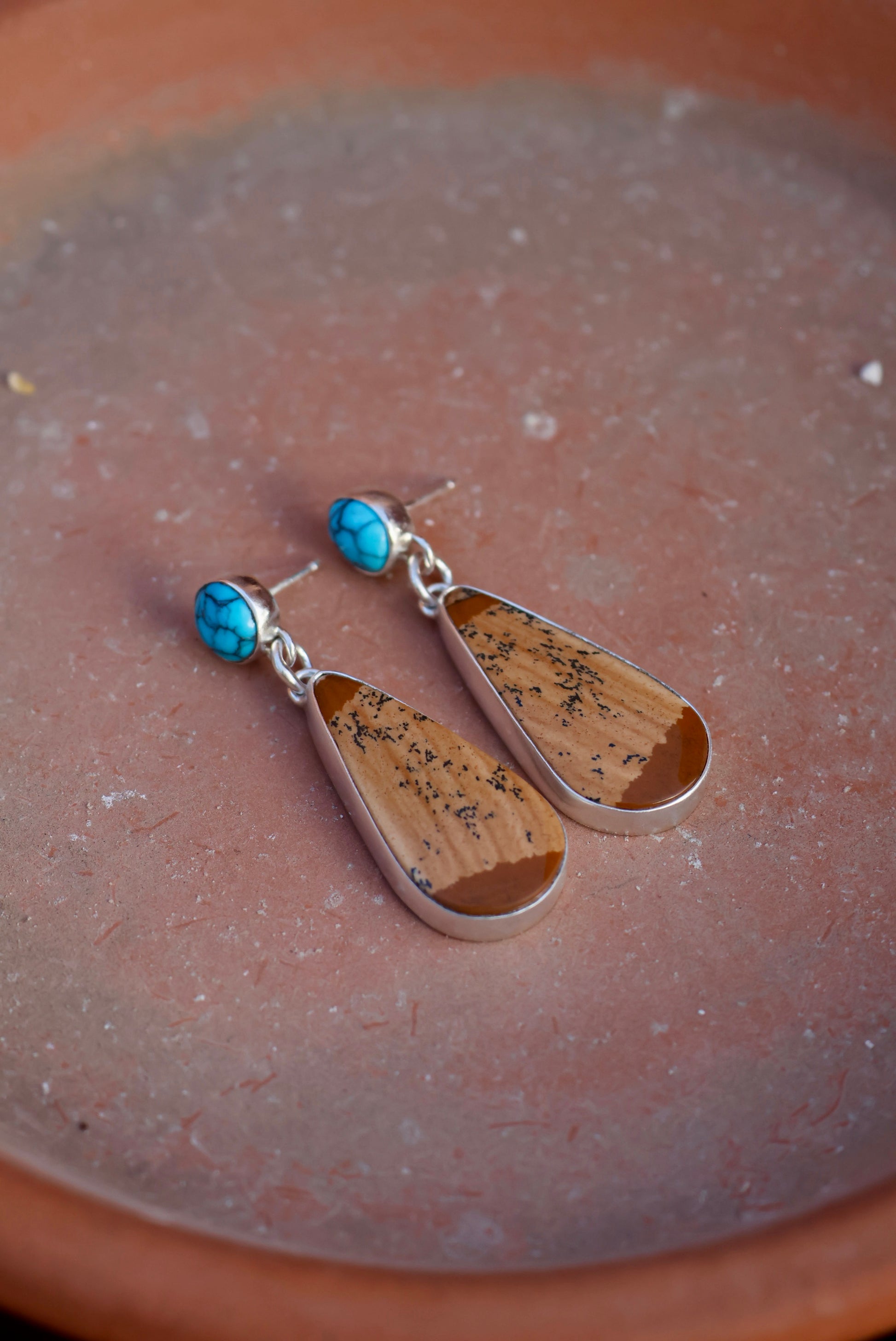 Kingman Turquoise and Picture Jasper cabochons are set in hand fabricated sterling silver bezel settings in these stud/dangly earrings.