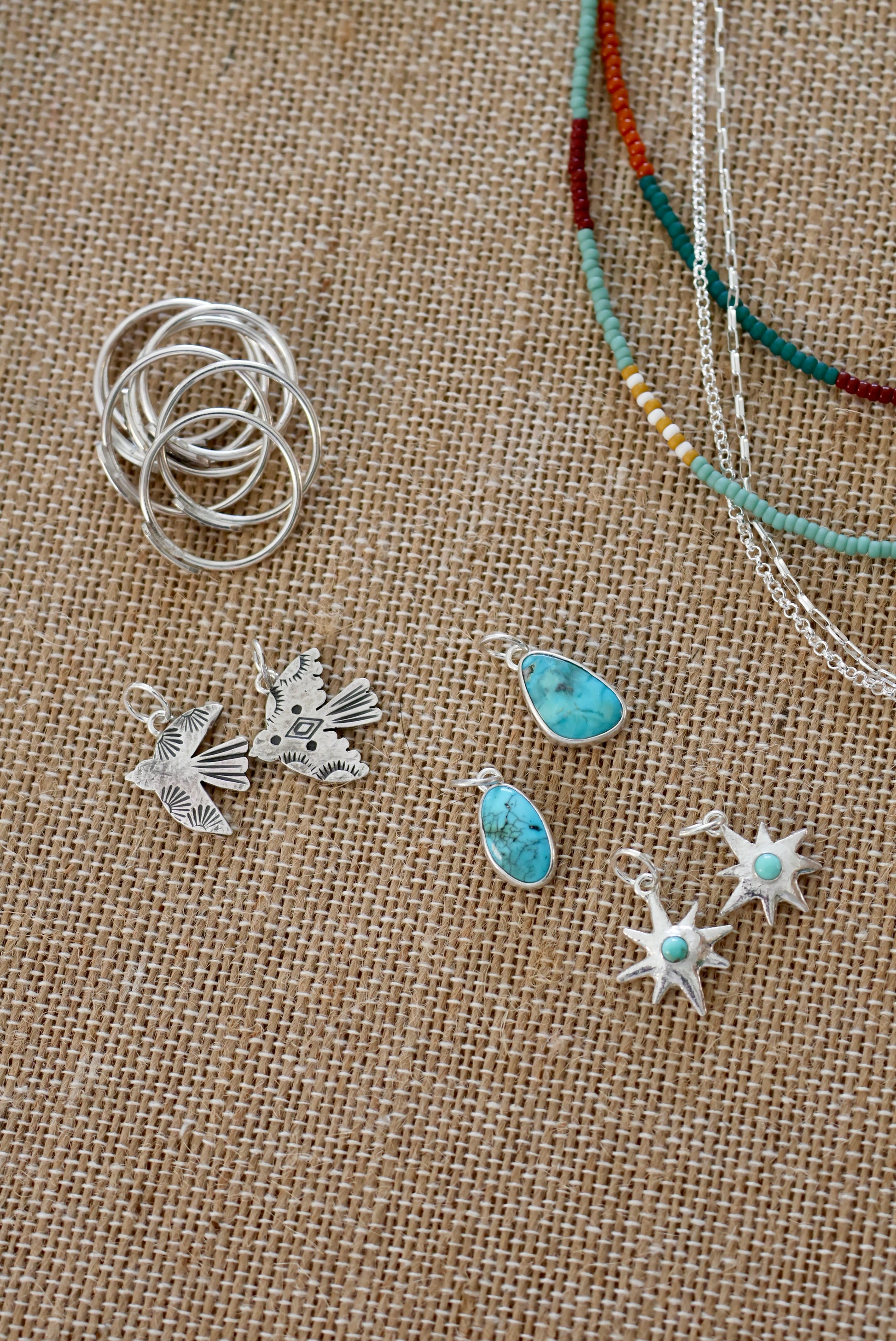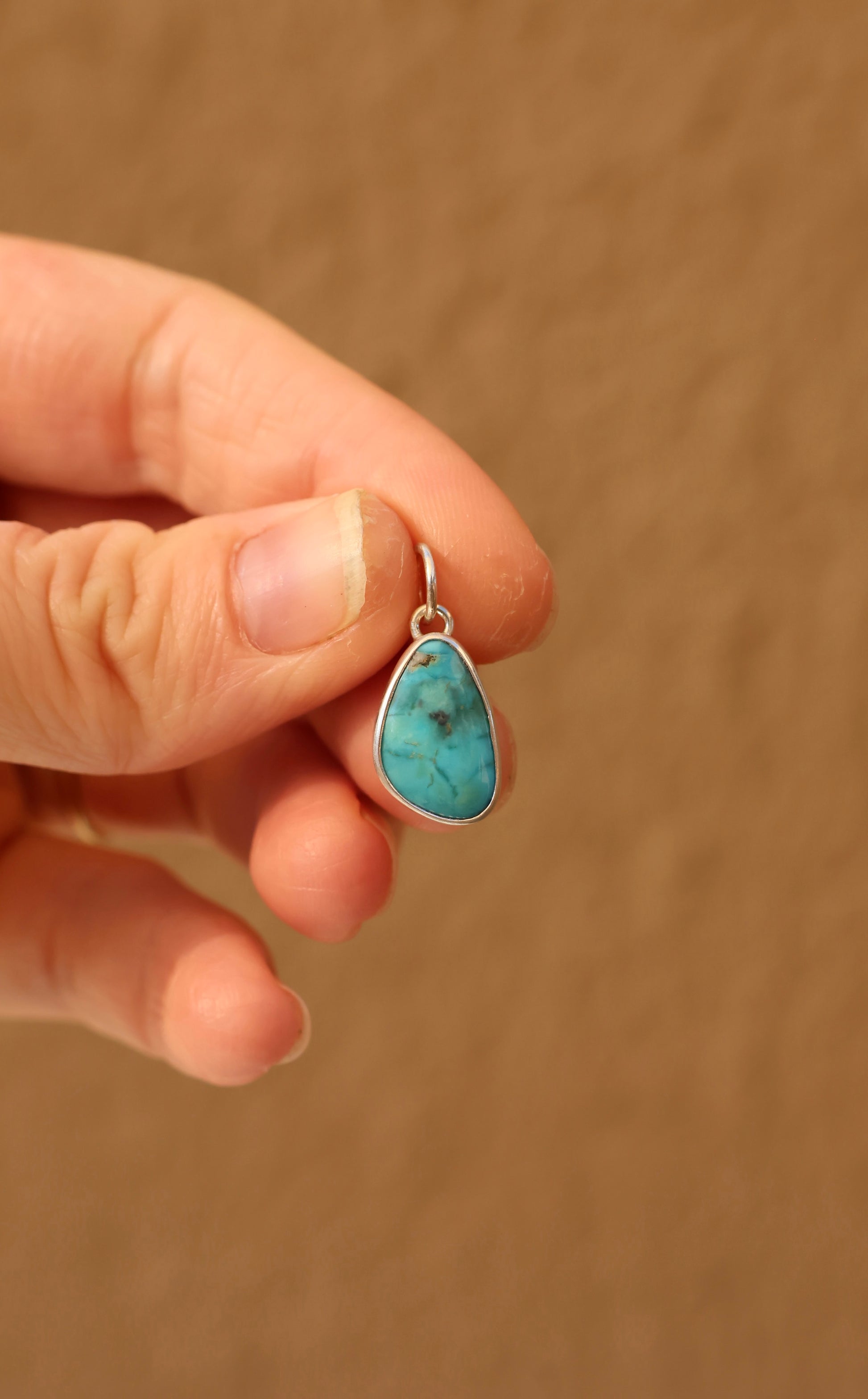 A freeform, almost triangular or teardrop in shape, Kingman Turquoise cabochon is set in a sterling silver bezel setting. Perfect for hanging on a plain silver chain, a seed bead necklace or the charm holder necklace!