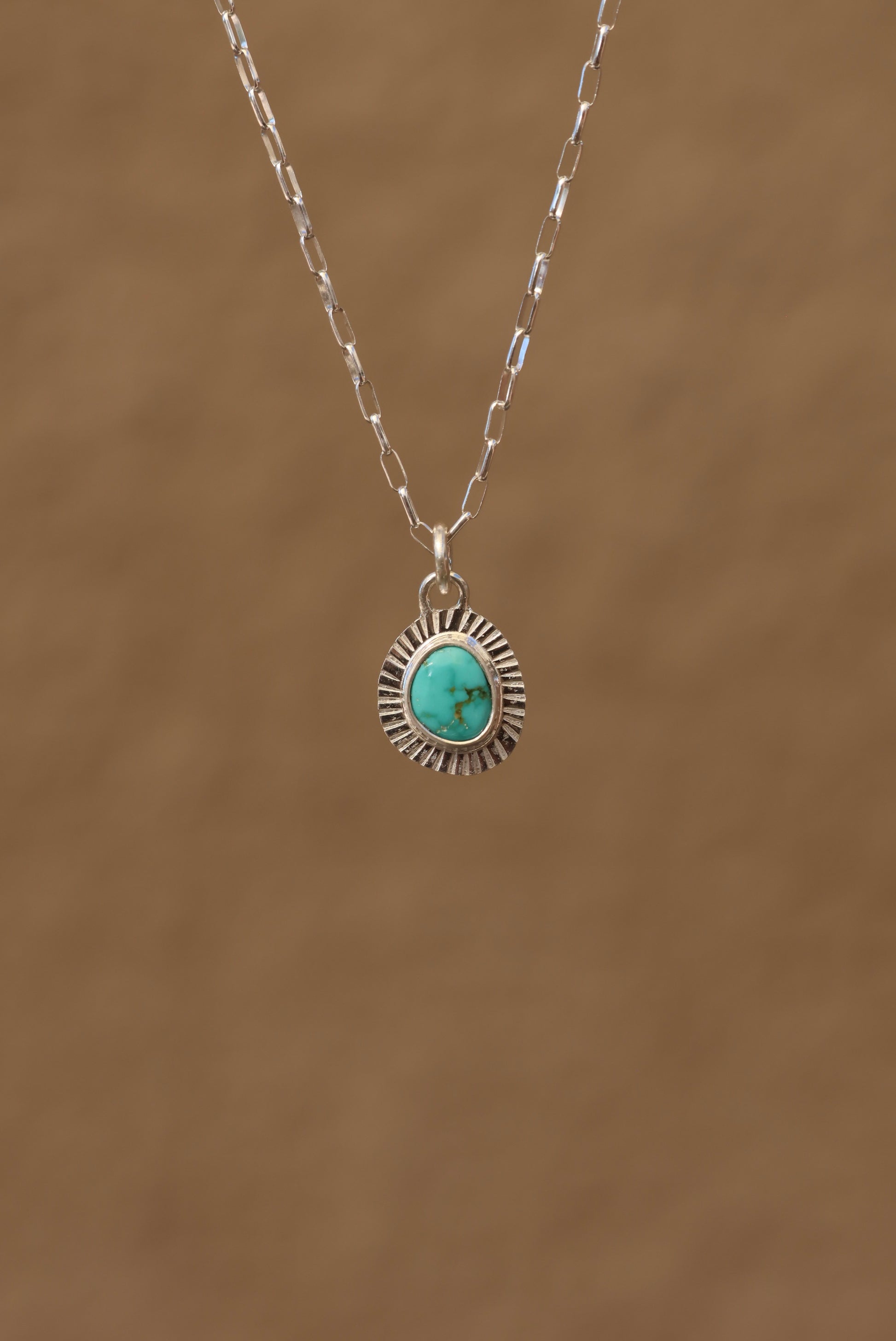 An itty bitty freeform Kingman Turquoise cabochon is set in a sterling silver bezel setting with a hand stamped sun ray border around the stone. Pendant hangs on a dainty paperclip like chain that is adjustable from 16" to 17."