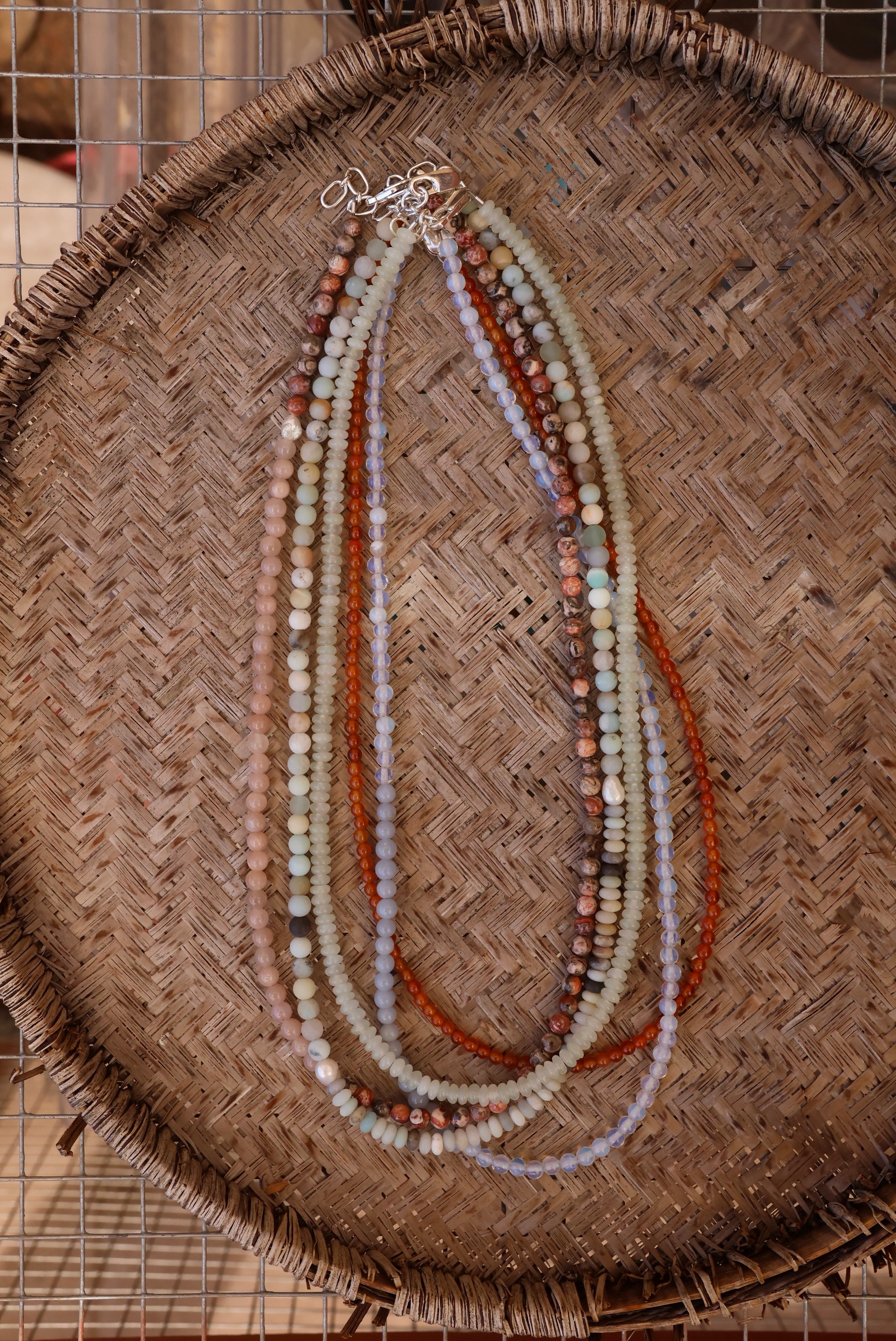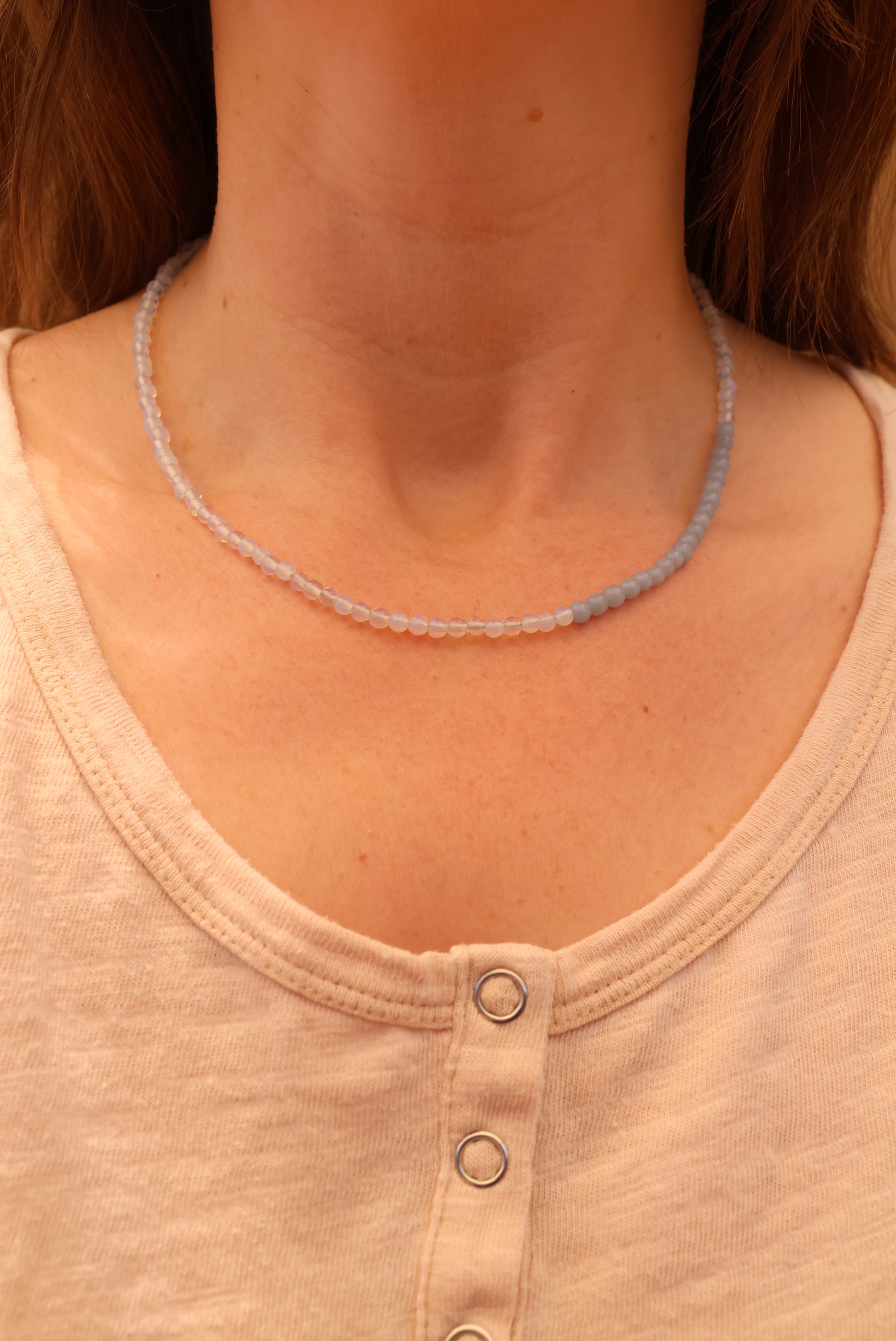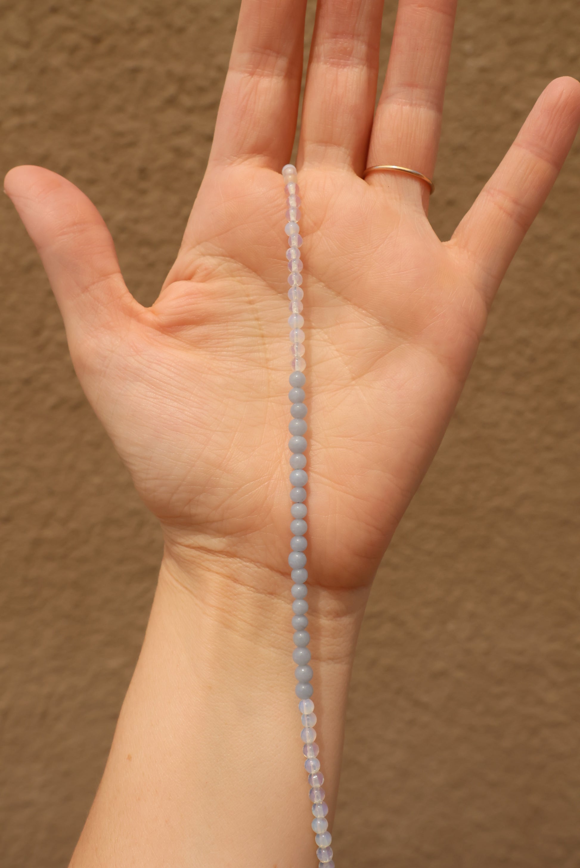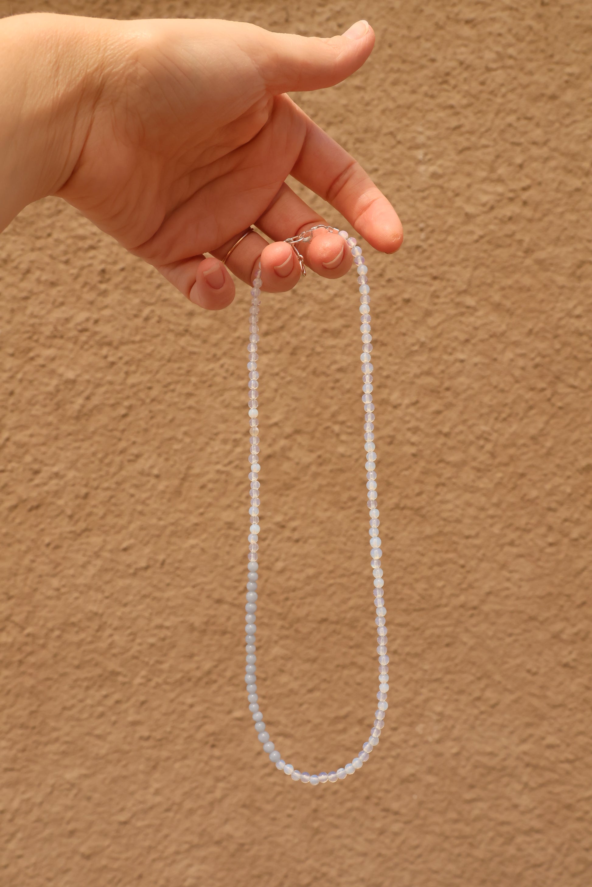A hand strung necklace featuring Opalite and Angelite beads. The necklace is finished off with a sterling silver lobster clasp and chain. Approximately 17.75-18.75” in length.