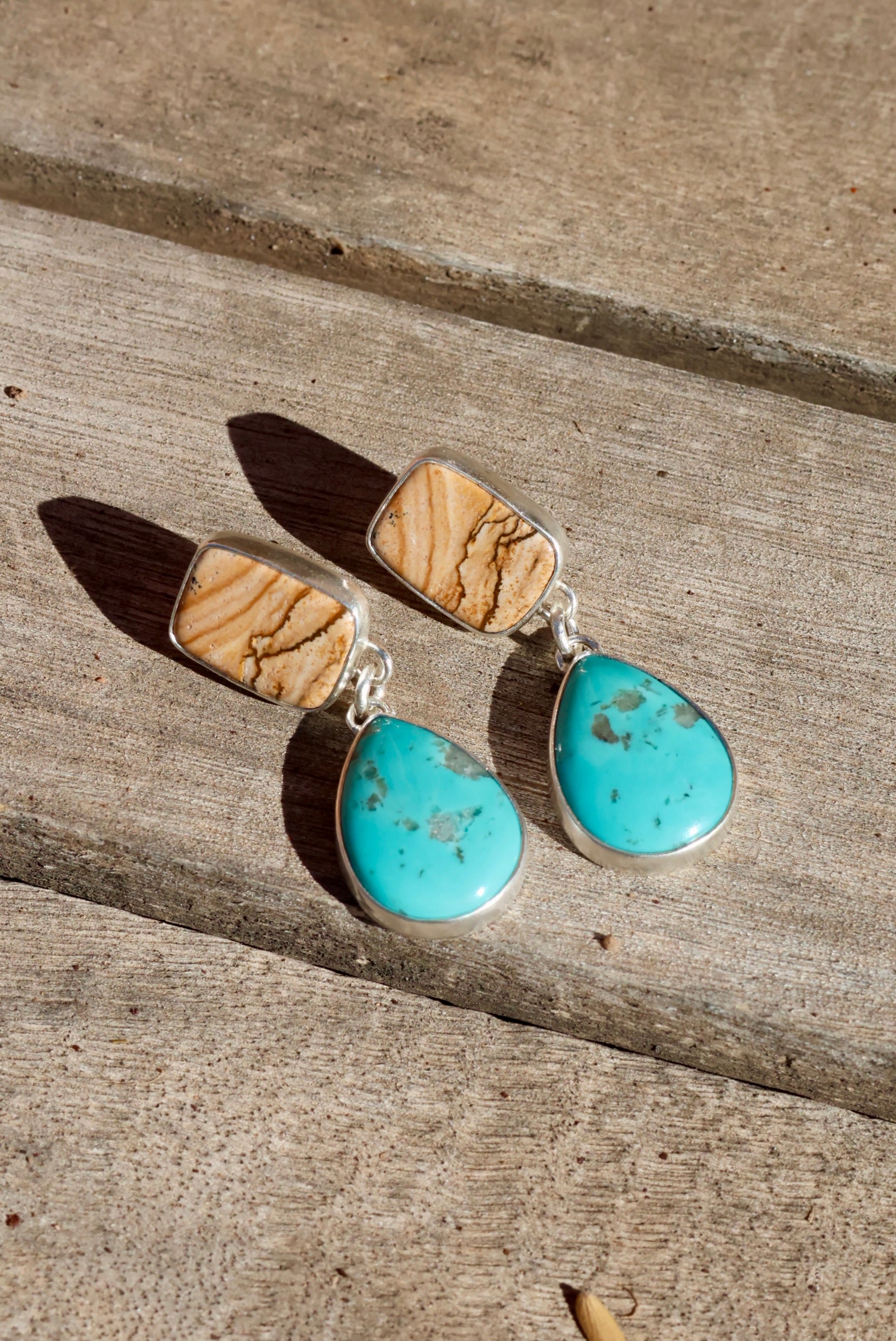 A handcrafted pair of sterling silver earrings featuring Picture Jasper and Kingman Turquoise.