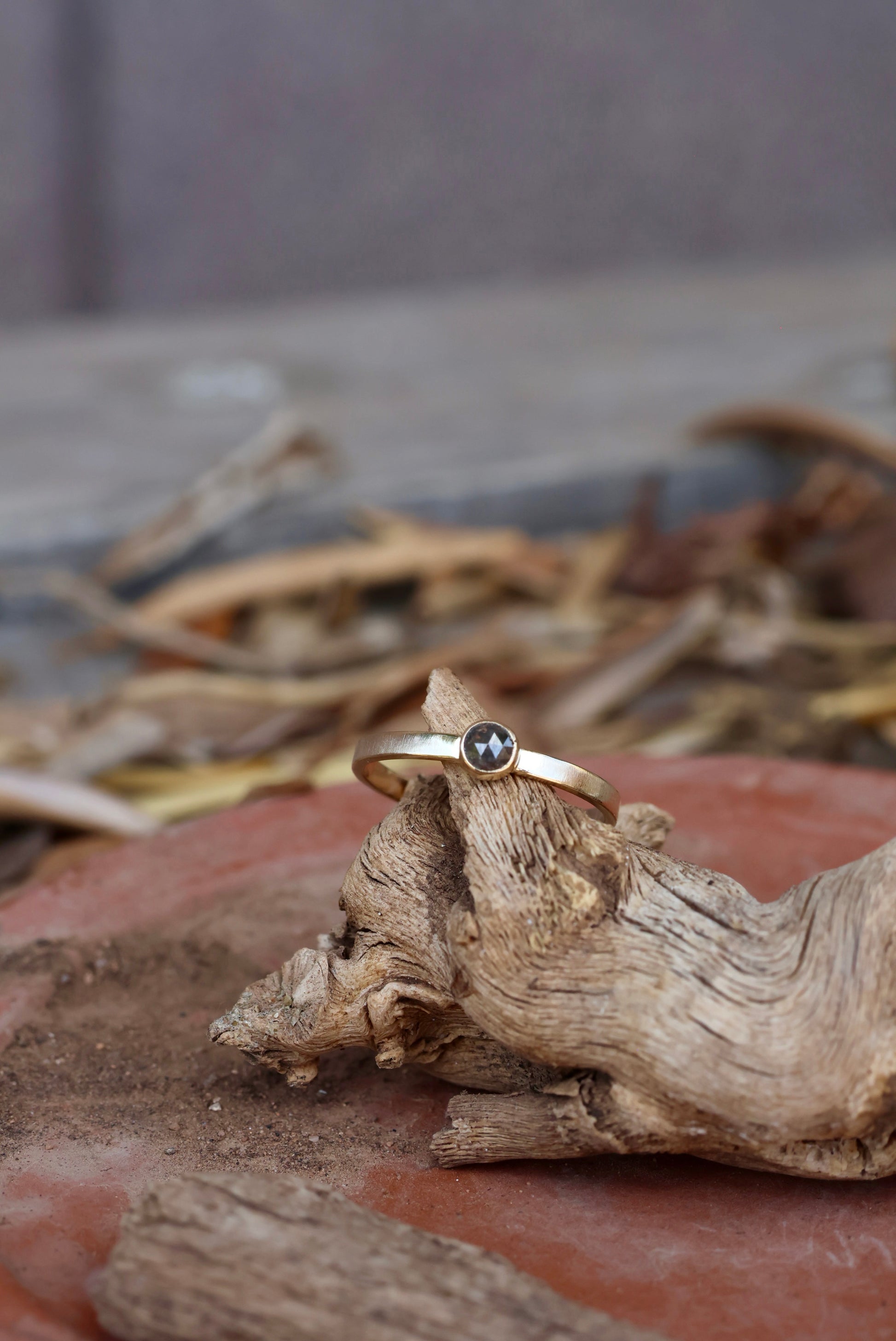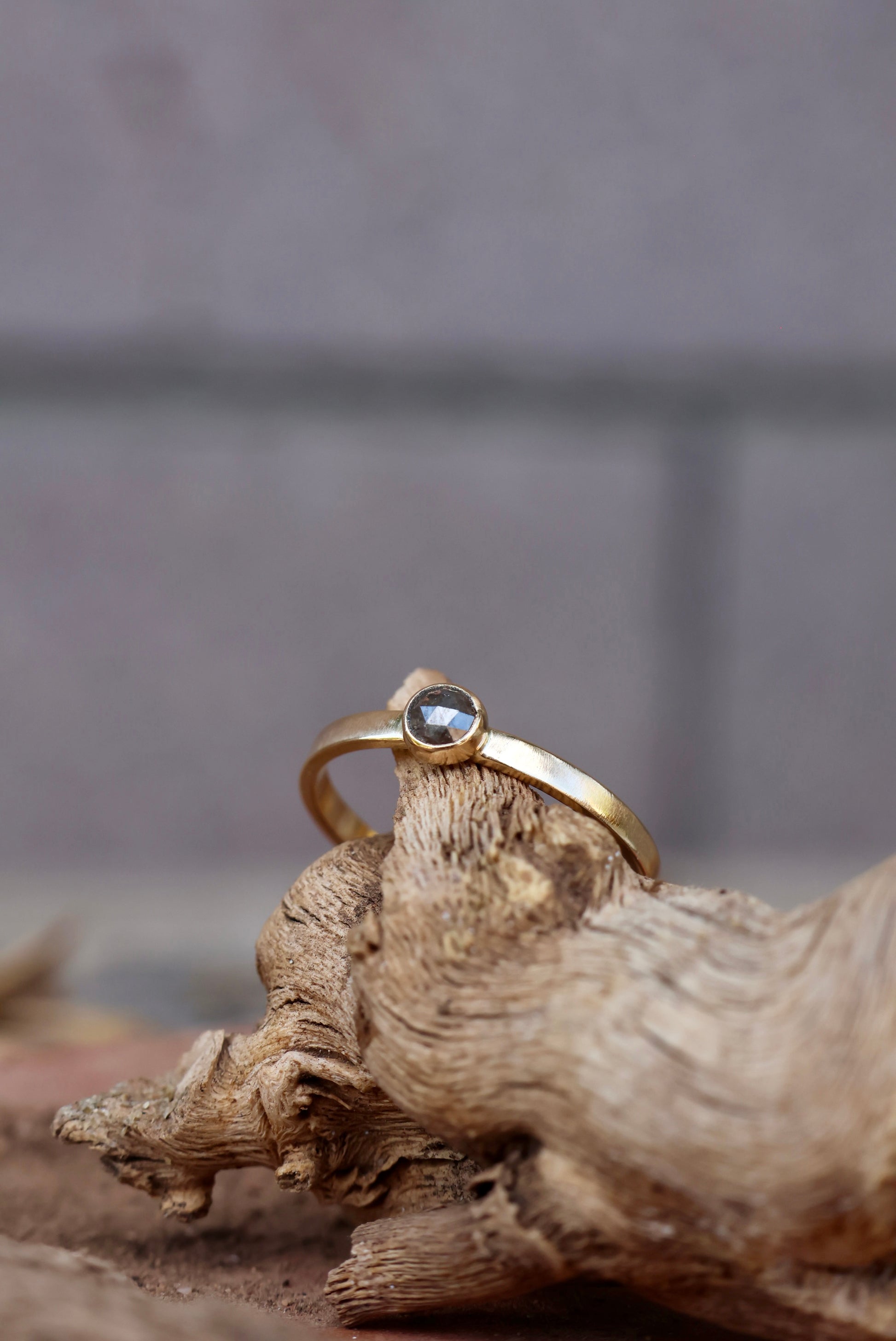 A roughly 4mm rose cut salt and pepper natural diamond is set in a hand fabricated 14k gold bezel setting and sits on a flat band measuring 2mm wide. Size 8.5.