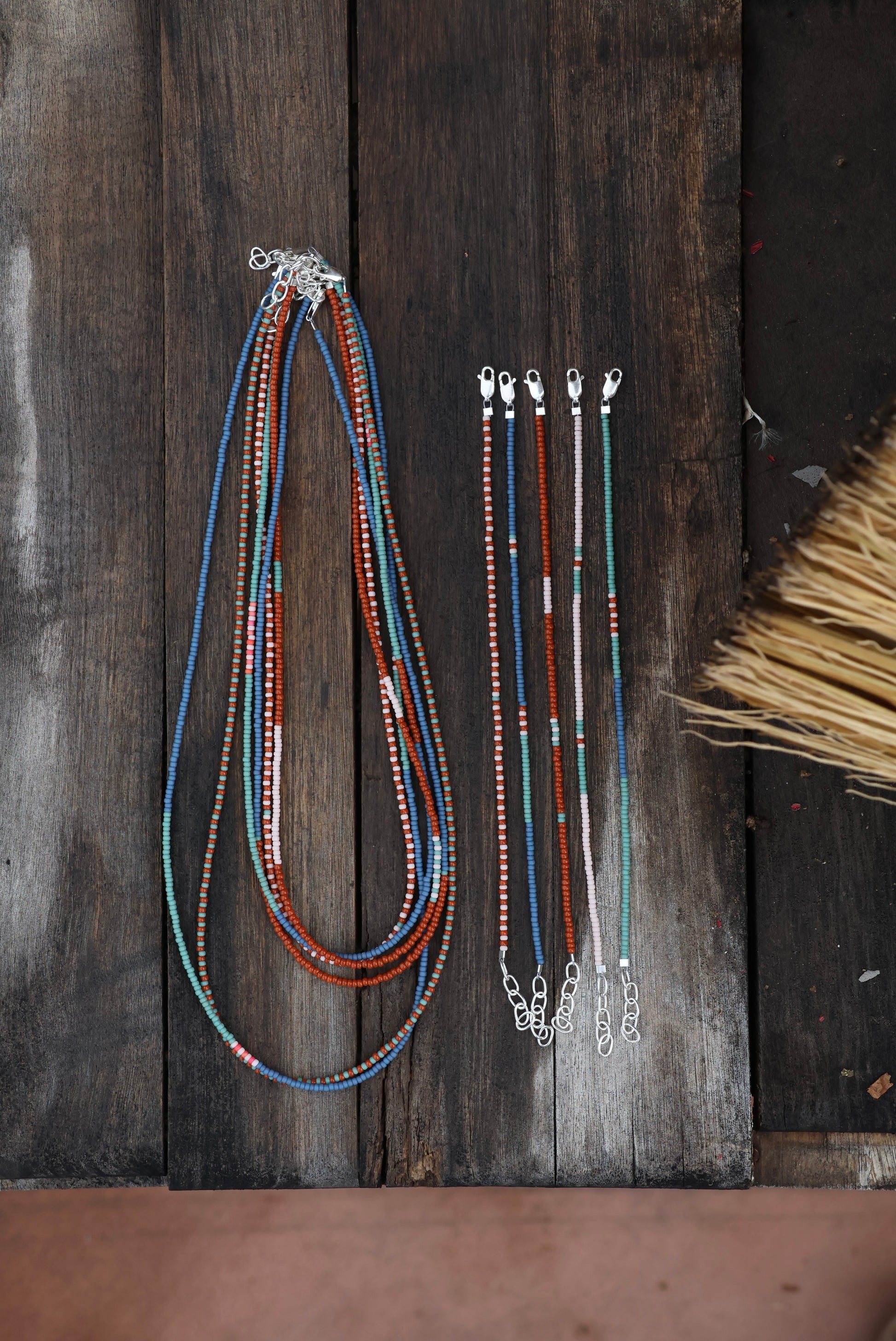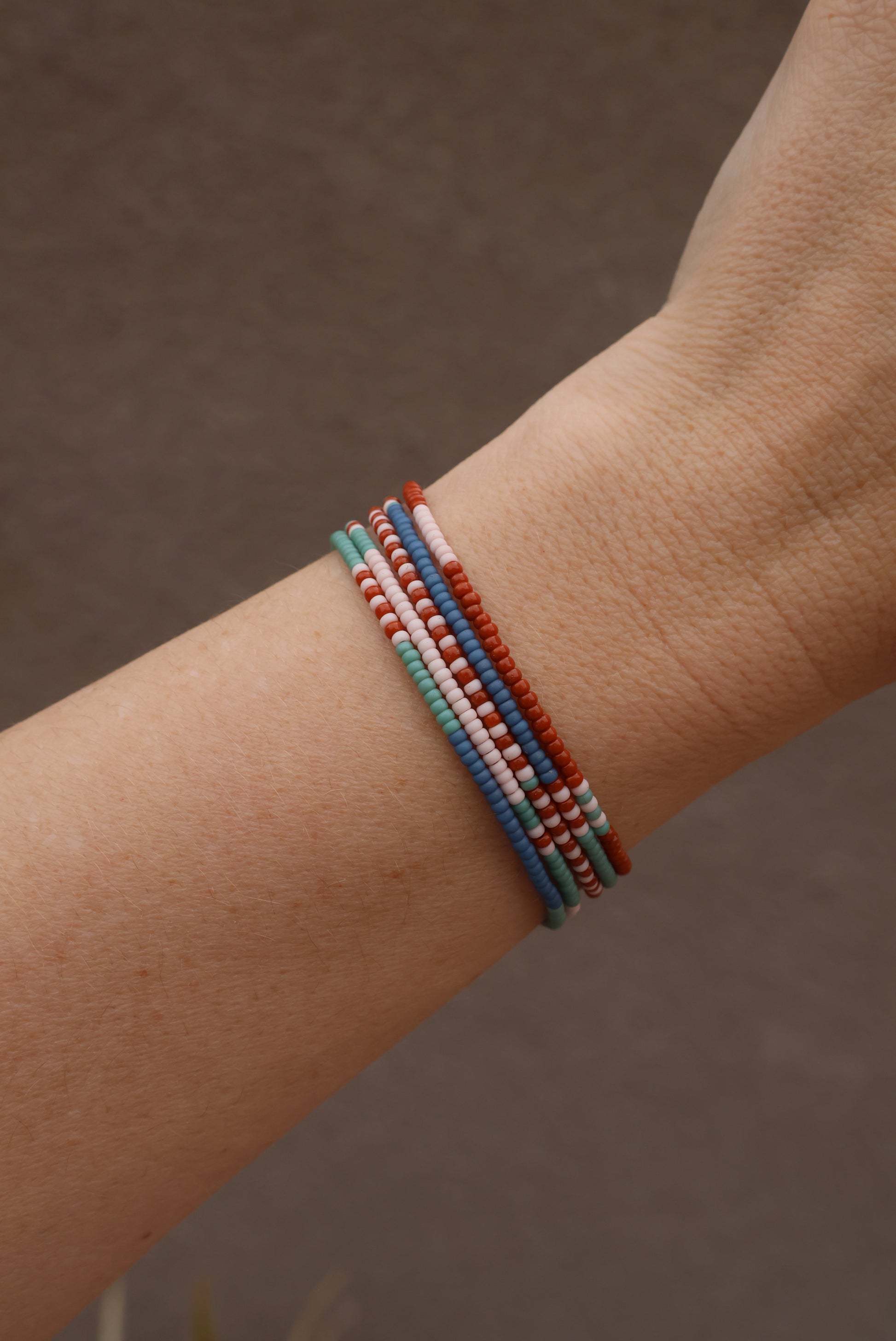 Mostly turquoise beads with one section of blue and one section of pale pink and rusty red/brown “stripes.”