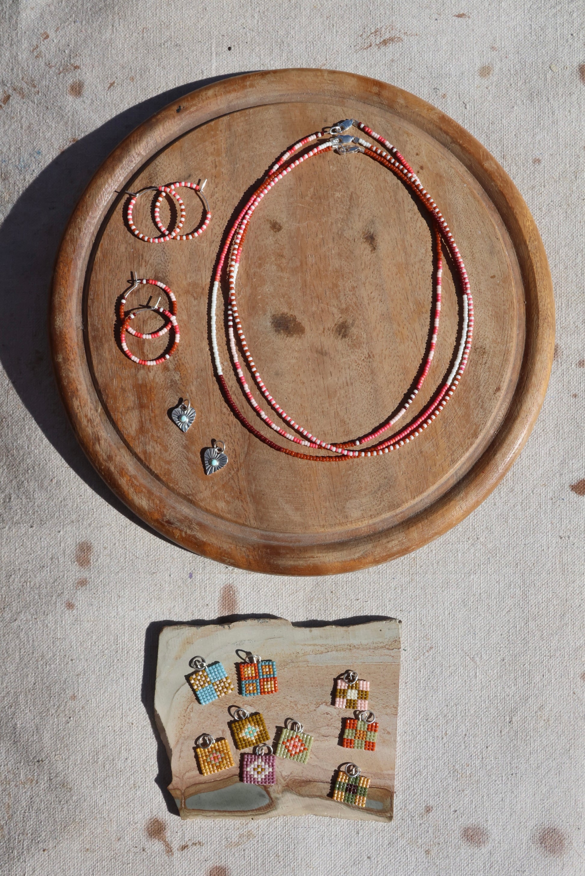 Sterling silver hoop earrings, just over an inch in diameter, with pink, white and rusty red/brown beads.