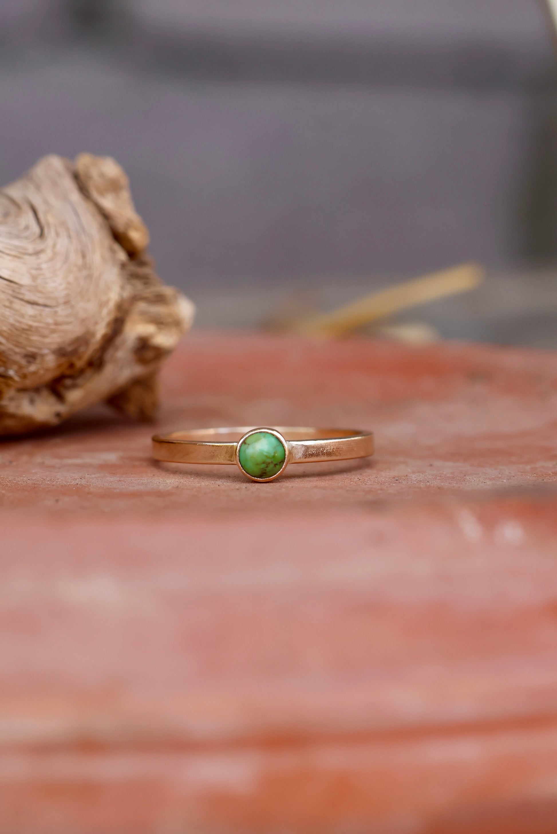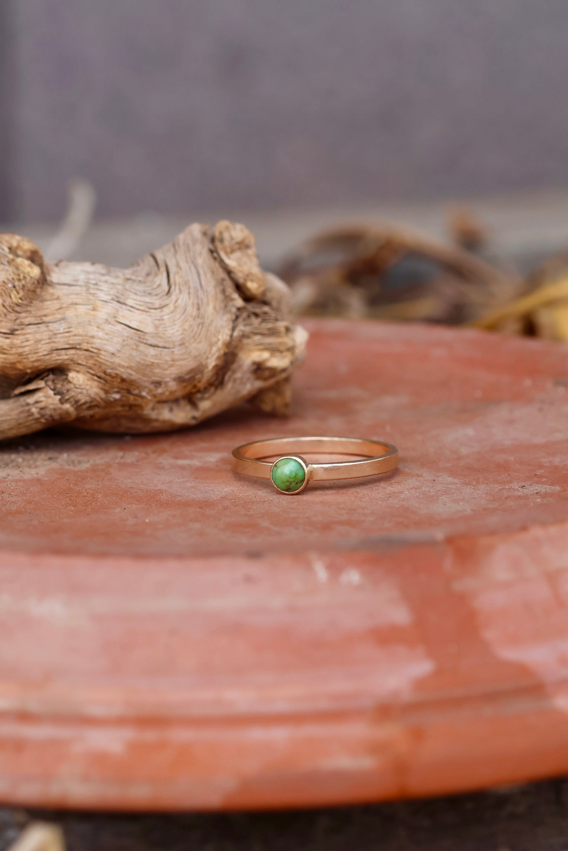 A 4mm green Sonoran Gold Turquoise cabochon is set in a solid 14k gold bezel setting and sits on a substantial flat band measuring 2mm wide. Size 8.