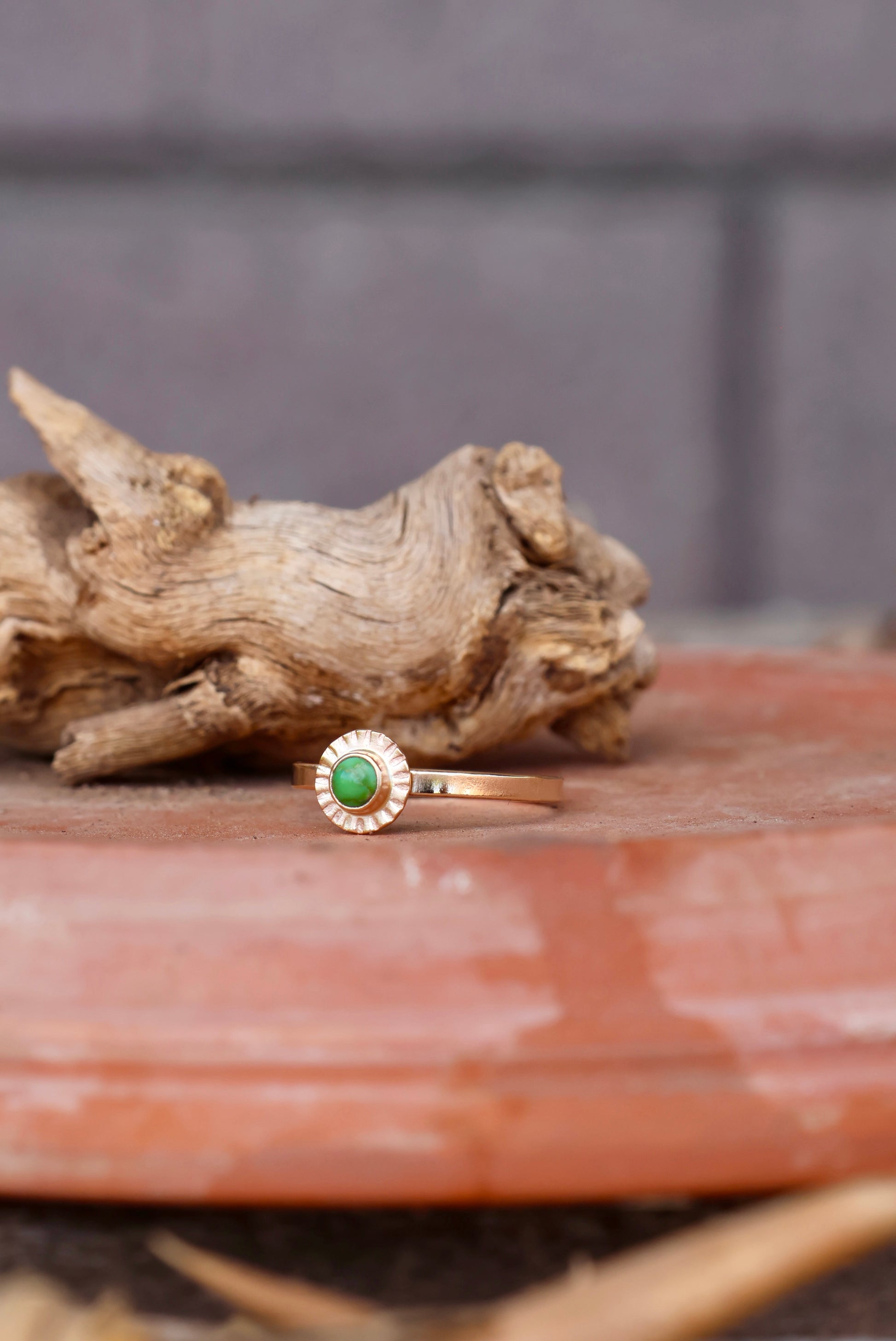 A 4mm green Sonoran Gold Turquoise cabochon is set in a solid 14k gold bezel setting on a hand stamped sun shaped disk on a substantial flat band, measuring 2mm wide.