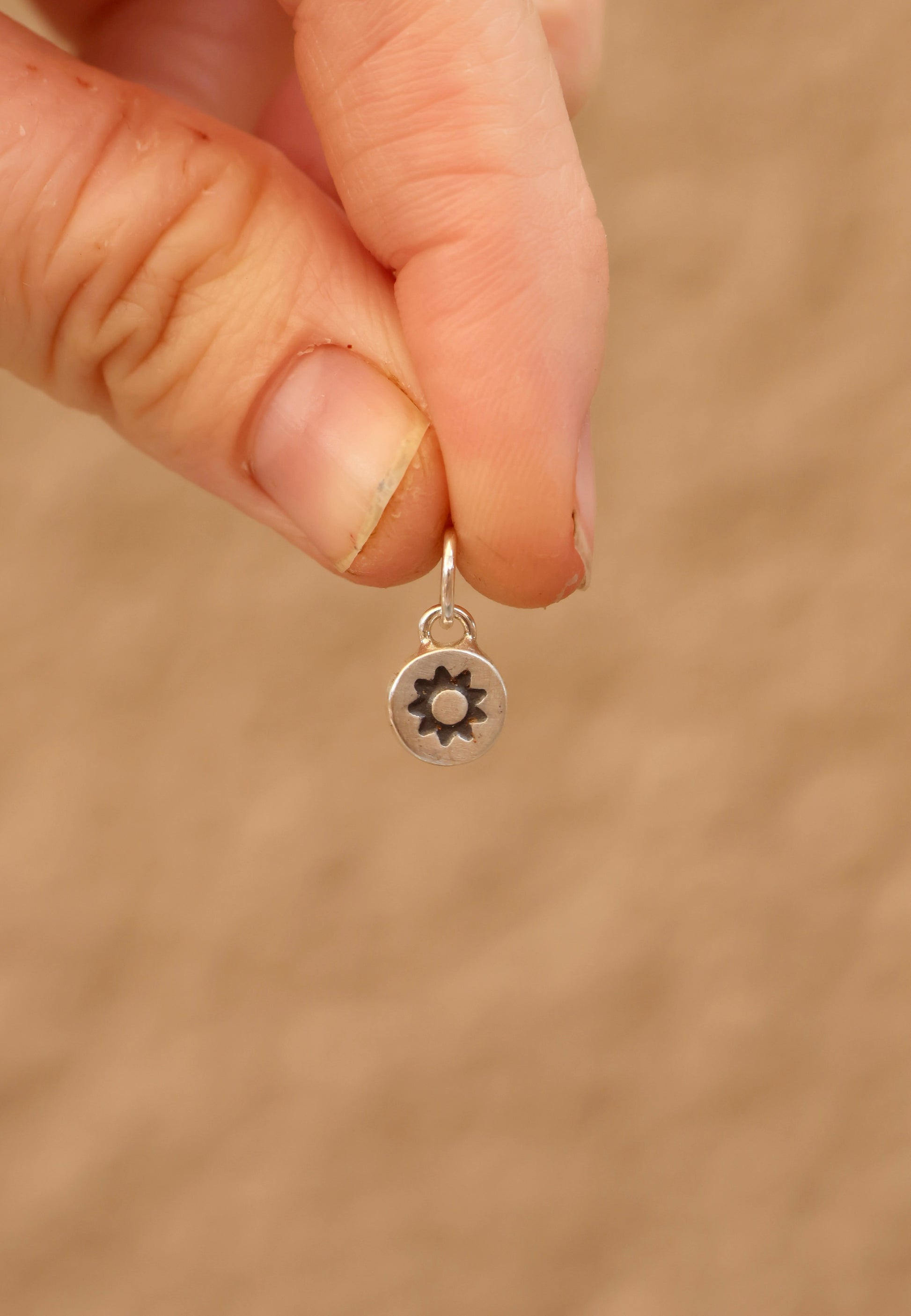 A hand fabricated sterling silver charm stamped with a sun. Made from recycled silver, milled in Allison's studio. A perfect addition to a seed bead necklace, a silver chain, or the charm holder necklace!