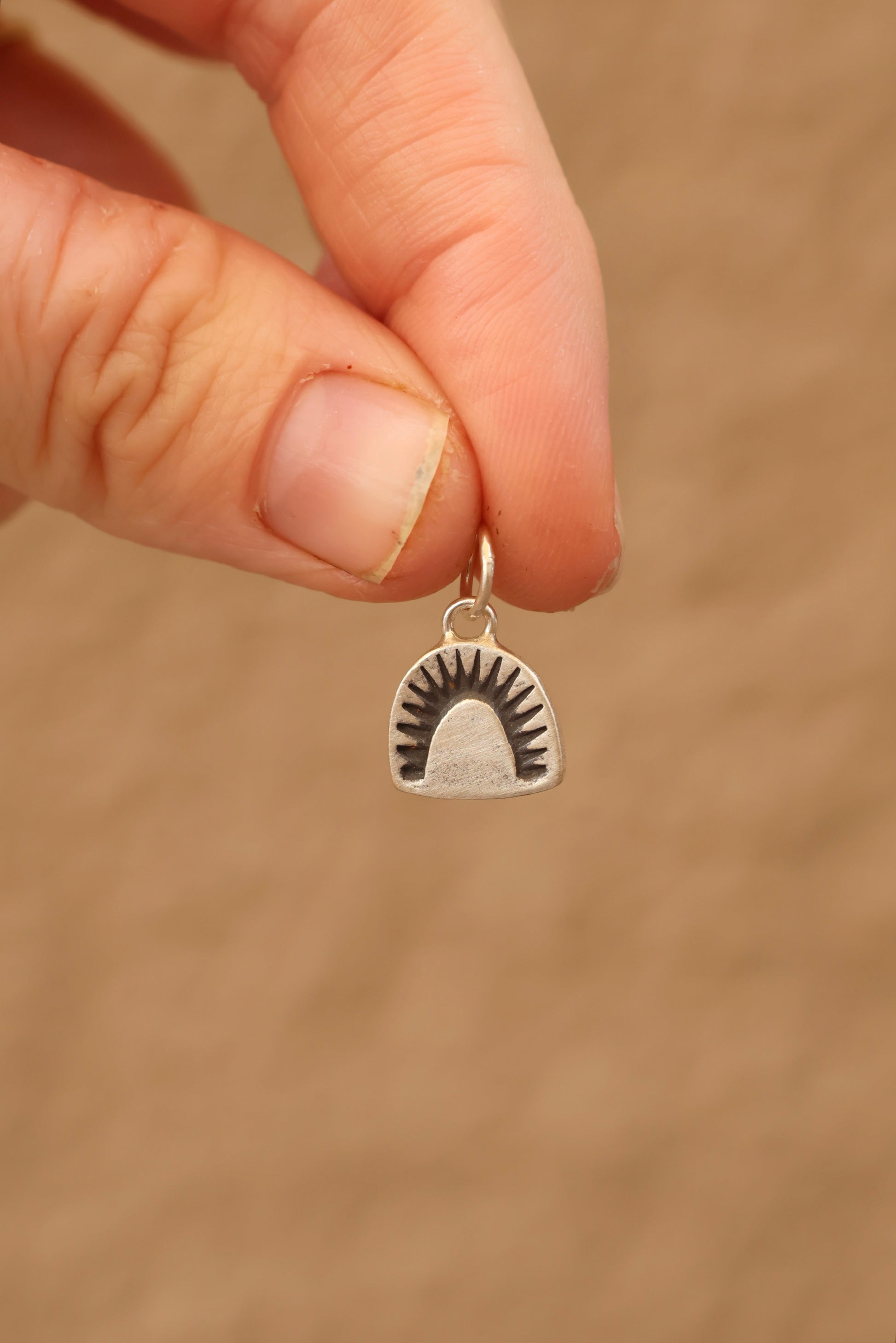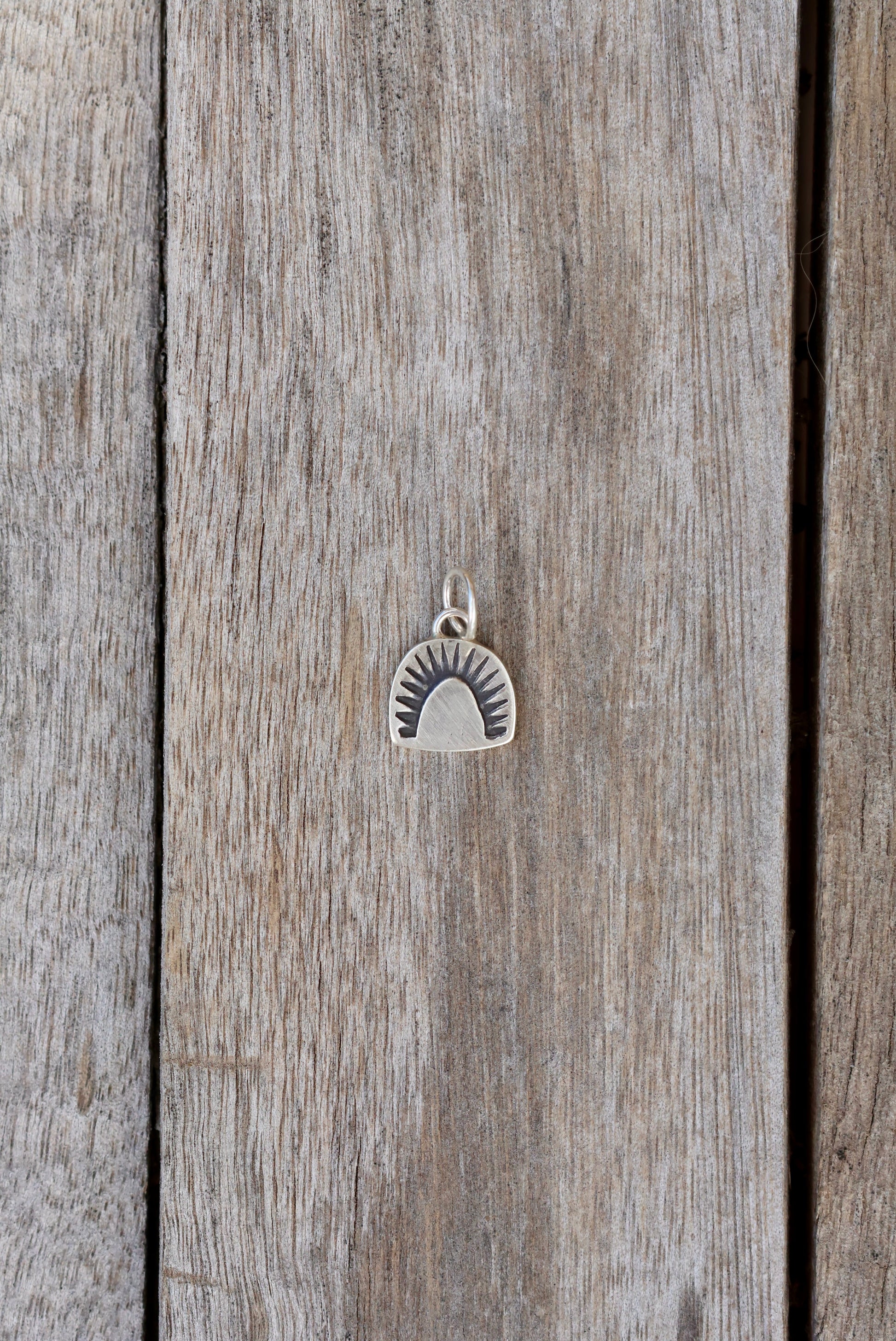 A hand fabricated sterling silver charm stamped with a sun ray arch. Made from recycled silver, milled in Allison's studio. A perfect addition to a seed bead necklace, a silver chain, or the charm holder necklace!