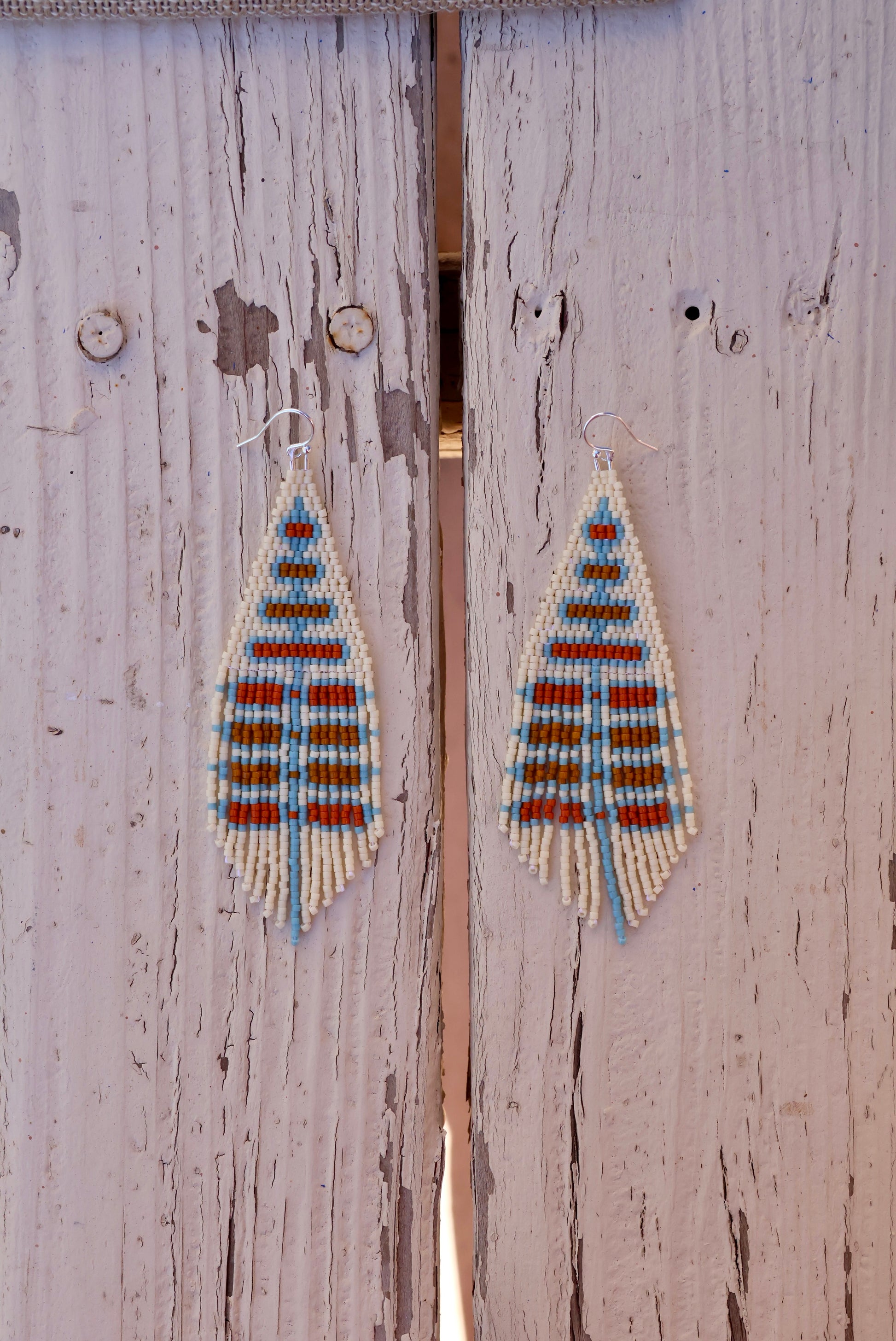 Handmade Myuki seed bead earrings with sterling silver thread guards and ear wires.