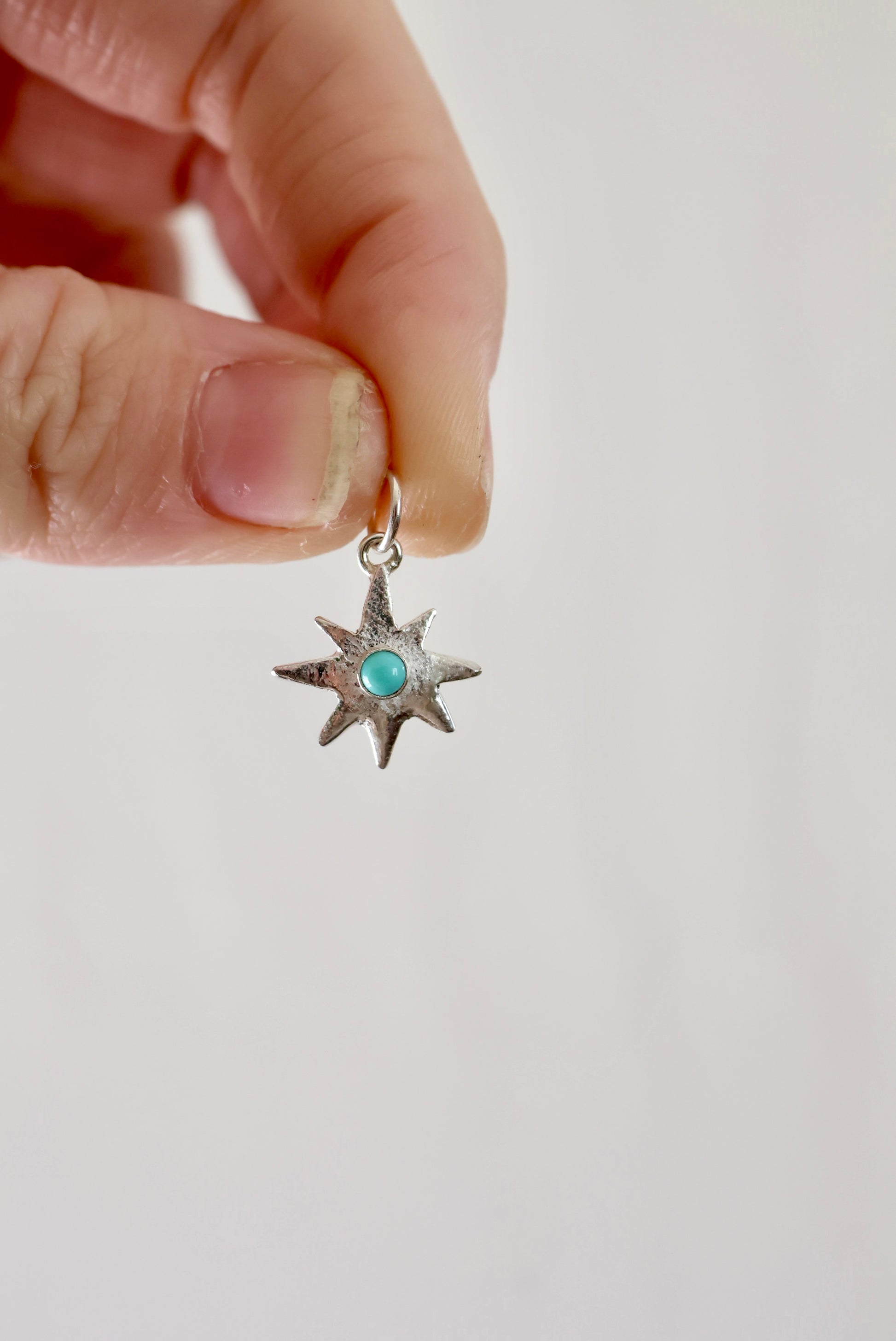 A hand fabricated sterling silver star charm with a 3mm Kingman Turquoise stone. Perfect for a plain silver chain, a seed bead necklace or the charm holder necklace!