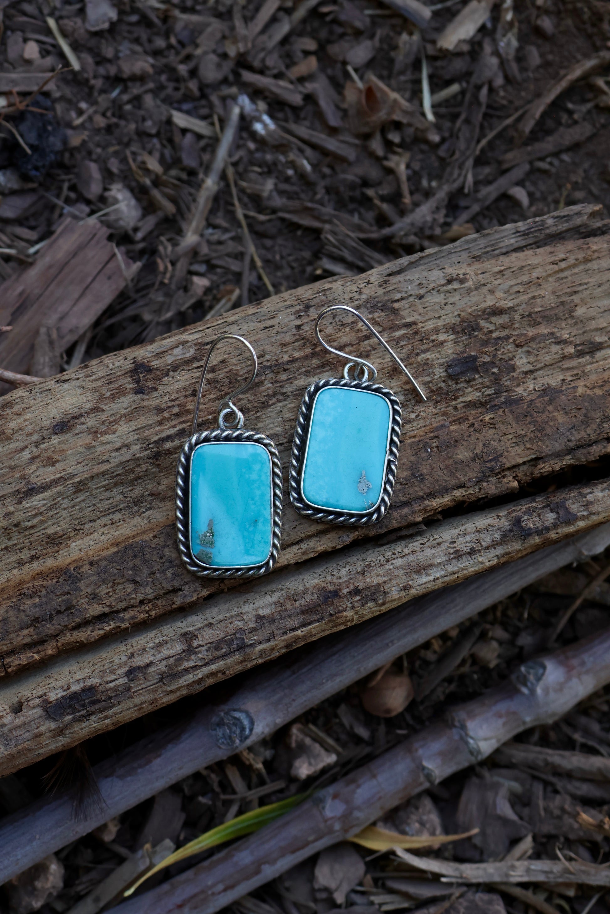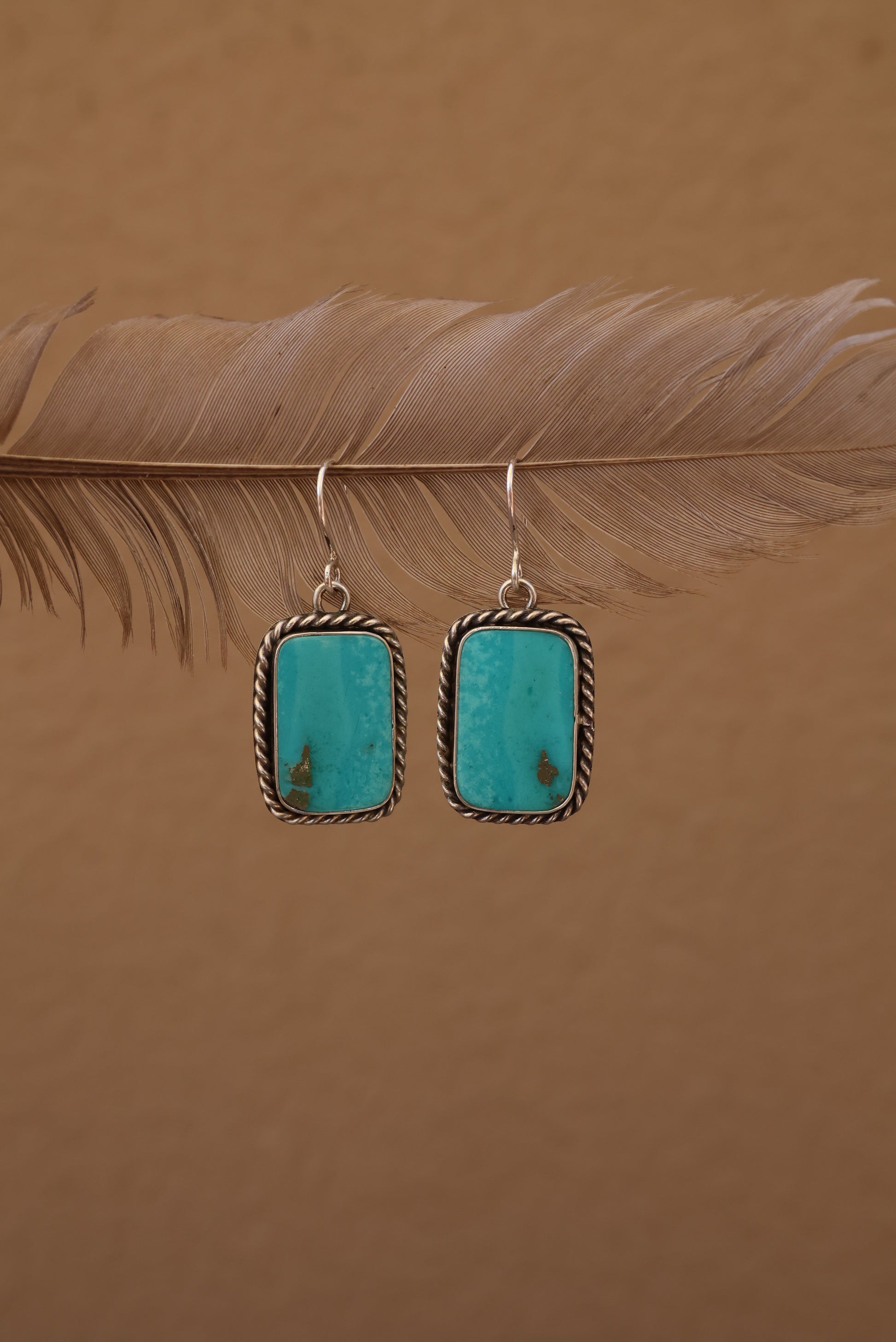 Rectangular shaped Kingman Turquoise cabochons are set in sterling silver bezel settings with a silver wire “rope” border. Sterling silver ear wires.